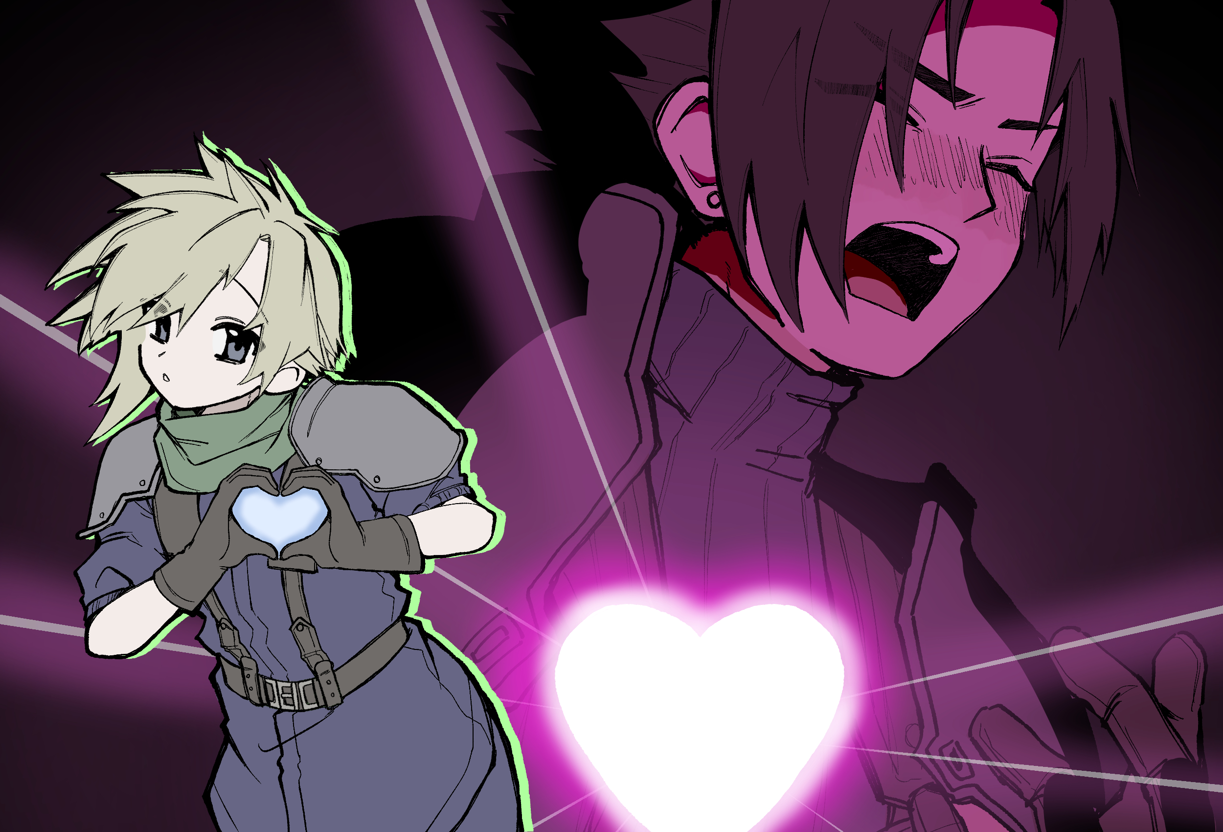 2boys :o armor belt black_background black_hair black_sweater blonde_hair blue_eyes blue_pants blue_shirt blush brown_belt brown_gloves bucchigiri?! cloud_strife commentary_request crisis_core:_final_fantasy_vii drop_shadow earrings final_fantasy final_fantasy_vii furrowed_brow gloves glowing green_scarf hands_up heart heart_hands highres jewelry kawa_2929_ff leaning_forward looking_at_viewer military_uniform multiple_boys nose_blush open_mouth pants parody parted_bangs parted_lips pauldrons scarf shinra_infantry_uniform shirt short_hair shoulder_armor stud_earrings suspenders sweater turtleneck turtleneck_sweater upper_body yaoi zack_fair