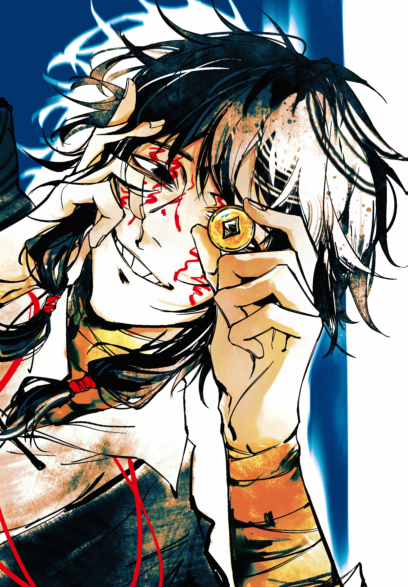 1boy black_eyes black_hair black_jacket chinese_commentary coin collarbone commentary_request facial_tattoo grin hand_on_own_face highres holding holding_coin holed_coin jacket low-tied_sidelocks male_focus open_clothes open_jacket shirt sidelocks smile solo tattoo touqi_guaitan white_shirt yan_(mingzhangyan39497) ziche_fuzhao