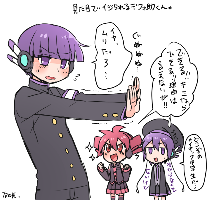 1girl 2girls antenna_hair arm_up beret black_hat black_pants black_shirt black_skirt black_sleeves black_thighhighs blunt_bangs blush buttons detached_sleeves double-parted_bangs drill_hair genderswap genderswap_(ftm) hair_between_eyes hands_up hat headphones kasane_teto kasane_teto_(utau) long_sleeves looking_at_another multiple_girls open_mouth pants pleated_skirt pocket purple_eyes purple_hair purple_trim red_eyes red_hair red_trim school_uniform shirt shorts signature skirt skirt_set sleeveless sleeveless_shirt speech_bubble sweatdrop thighhighs tongue translation_request twin_drills utane_oto utane_uta utau very_long_sleeves yuusuke-kun zettai_ryouiki
