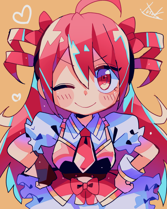 ahoge alternate_costume alternate_hairstyle blush bow brown_gloves closed_mouth collared_dress double-parted_bangs dress drill_hair fingerless_gloves gloves hair_between_eyes hair_bow hands_on_own_hips heart kasane_teto layered_dress long_hair necktie one_eye_closed red_bow red_dress red_eyes red_hair red_necktie short_necktie signature single_glove single_wrist_cuff smile twin_drills utau white_dress white_wrist_cuffs wing_collar wrist_cuffs yellow_background yuusuke-kun