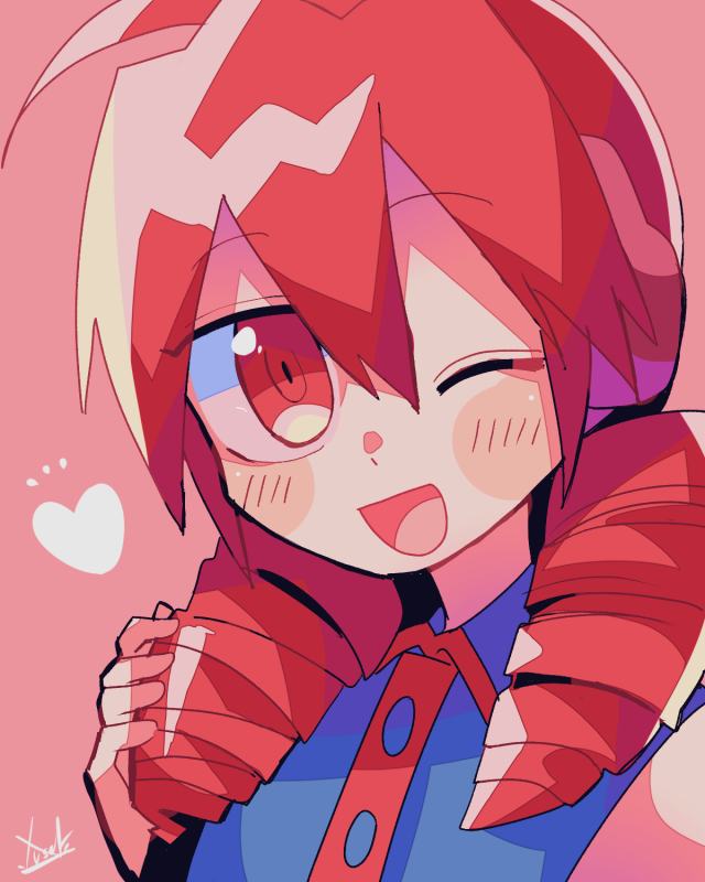 1girl ahoge blush buttons collared_shirt double-parted_bangs drill_hair hair_between_eyes headphones kasane_teto kasane_teto_(utau) one_eye_closed open_mouth pink_background red_eyes red_hair red_trim shirt sleeveless sleeveless_shirt solo tongue twin_drills utau wing_collar yuusuke-kun