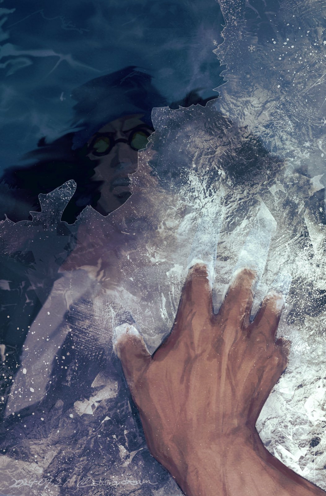 1boy aokiji_(one_piece) beanie black_hair closed_mouth cryokinesis dark-skinned_male dark_skin dated devil_fruit_power hat highres ice male_focus mature_male one_piece pov pov_hands reflection reflection_focus reflective_liquid round_eyewear shiro_dream snow snowflakes solo twitter_username water