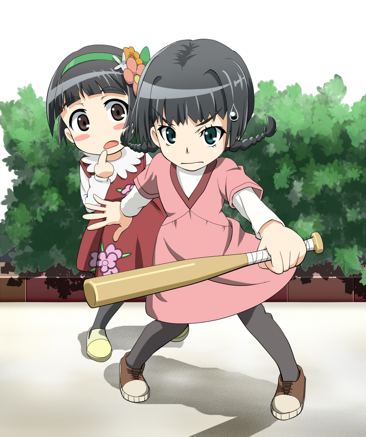2girls aged_down baseball_bat blush_stickers braid child dress flower hair_flower hair_ornament kayaku_(banban) multiple_girls pantyhose saten_ruiko sweatdrop toaru_kagaku_no_railgun toaru_majutsu_no_index twin_braids twintails uiharu_kazari