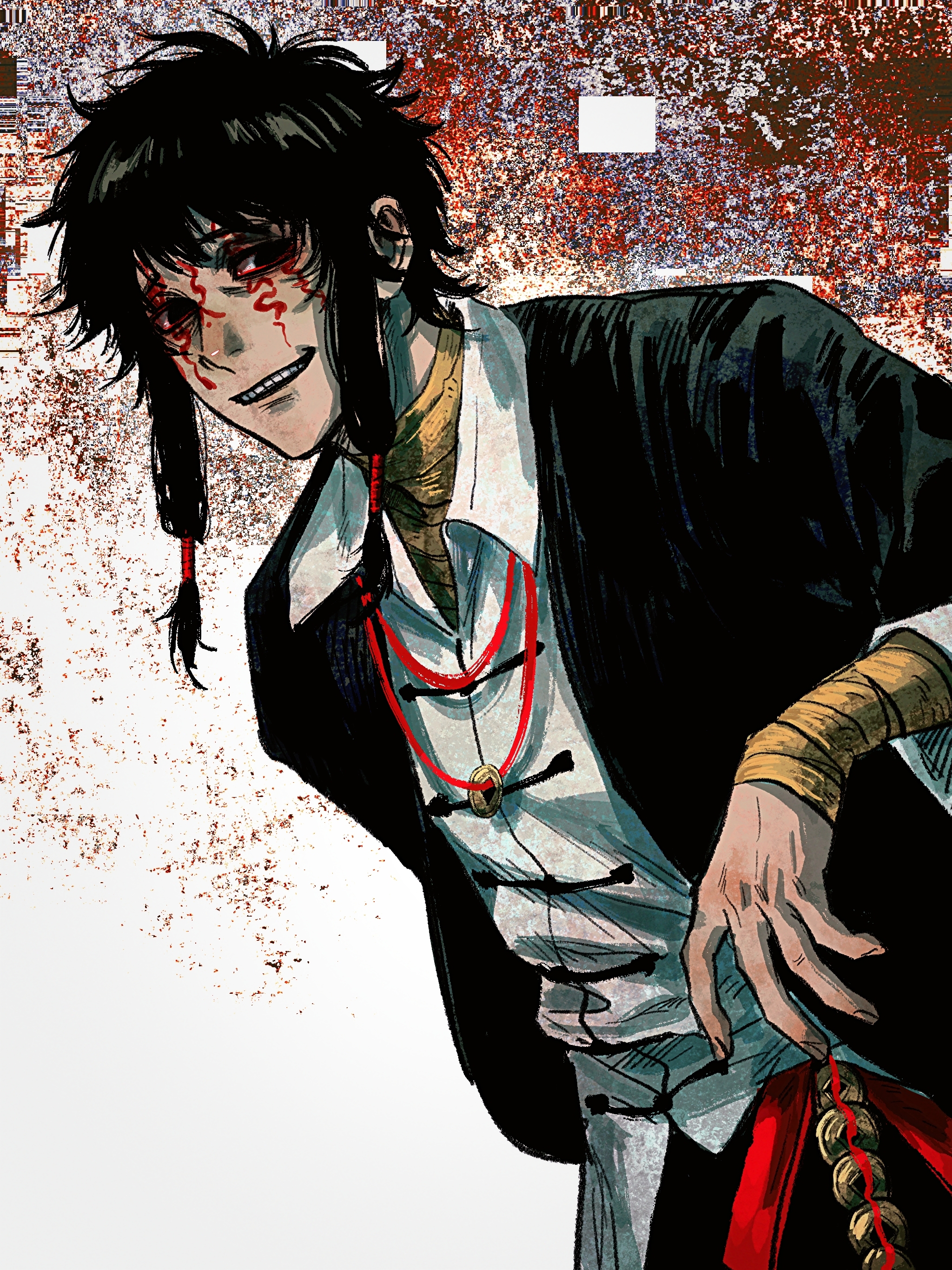 1boy absurdres bandaged_arm bandaged_neck bandages black_eyes black_hair black_jacket black_pants chinese_commentary coin coin_on_string collared_shirt commentary_request cowboy_shot facial_tattoo gasoline_(gasoline86327) grin highres holed_coin jacket jewelry long_sleeves low-tied_sidelocks male_focus mole mole_under_eye necklace open_clothes open_collar open_jacket pants shirt short_hair_with_long_locks sidelocks smile solo tattoo touqi_guaitan white_shirt ziche_fuzhao