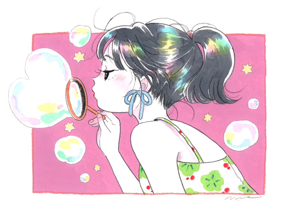 1girl black_eyes black_hair blowing blowing_bubbles blue_bow blush border bow bow_earrings bubble bubble_wand commentary earrings emamemamo33 facing_to_the_side fingernails hair_behind_ear jewelry original painting_(medium) pink_background ponytail red_lips simple_background solo spaghetti_strap star_(symbol) traditional_media upper_body watercolor_(medium) white_border