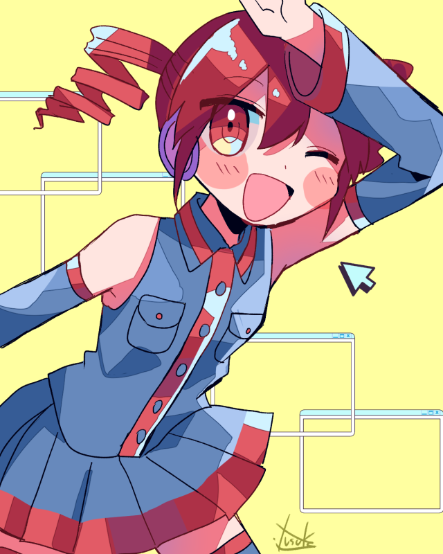 1girl arm_above_head arm_up black_skirt black_thighhighs blush collared_shirt cowboy_shot cursor detached_sleeves drill_hair hair_between_eyes headphones kasane_teto kasane_teto_(utau) long_sleeves looking_at_viewer one_eye_closed open_mouth parted_bangs pleated_skirt pocket red_eyes red_hair red_trim shirt signature skirt skirt_set sleeveless sleeveless_shirt solo thighhighs tongue twin_drills utau window_(computing) wing_collar yellow_background yuusuke-kun zettai_ryouiki