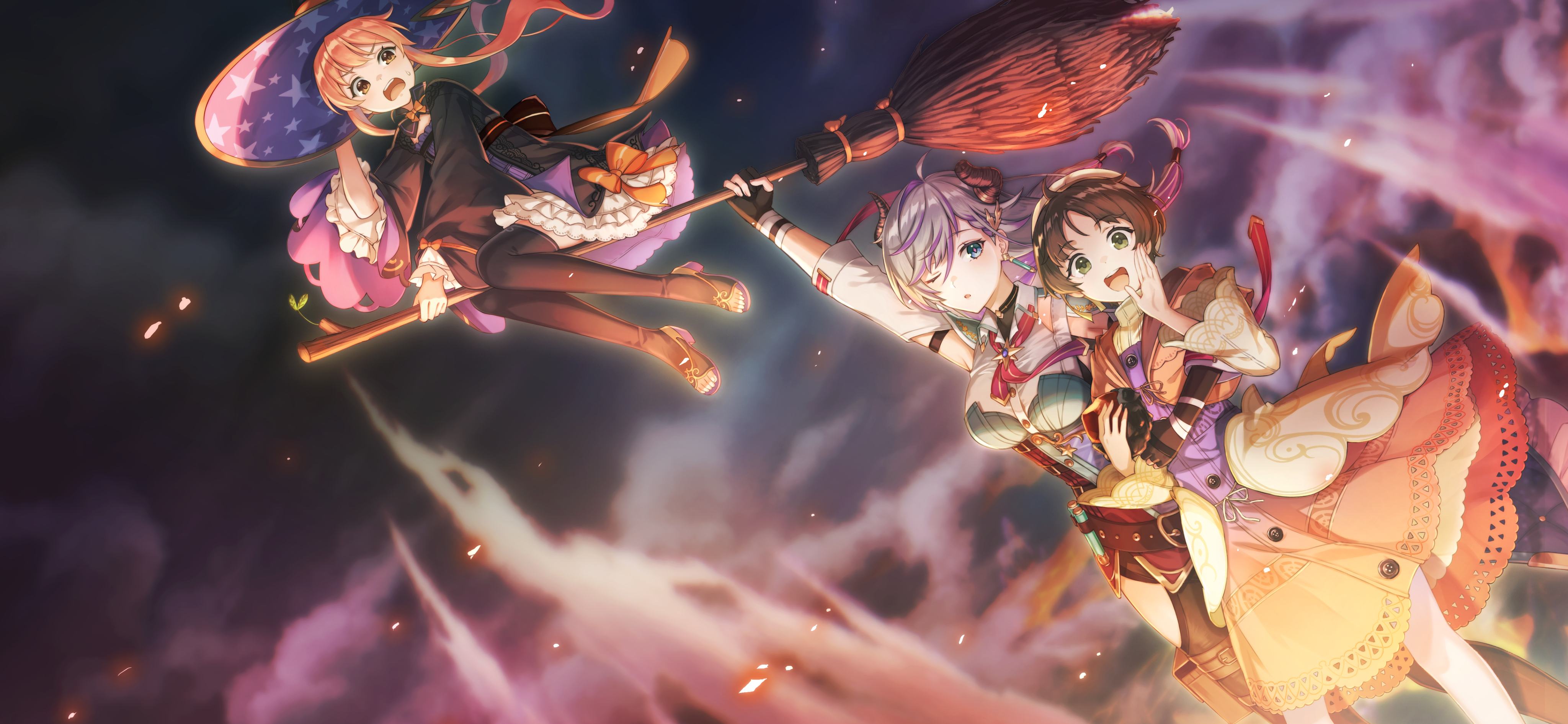 3girls :d absurdres ahoge atelier_(series) atelier_ayesha atelier_resleriana black_dress black_footwear black_gloves broken_horn broom broom_riding brown_eyes brown_hair carrying carrying_person cloud demon_horns dress flying frilled_dress frilled_sleeves frills frown furrowed_brow game_cg gloves gradient_clothes gradient_dress green_eyes hair_between_eyes hair_ornament hand_up hat high_heels highres horns long_hair long_sleeves looking_at_viewer multiple_girls night nio_altugle non-web_source official_art open_mouth orange_ribbon outdoors parted_bangs partially_fingerless_gloves print_headwear ribbon self-datamine short_hair sidelocks sky smile star_(symbol) star_print sweatdrop toeless_footwear valeria_(atelier) wilbell_voll-ersleid witch witch_hat