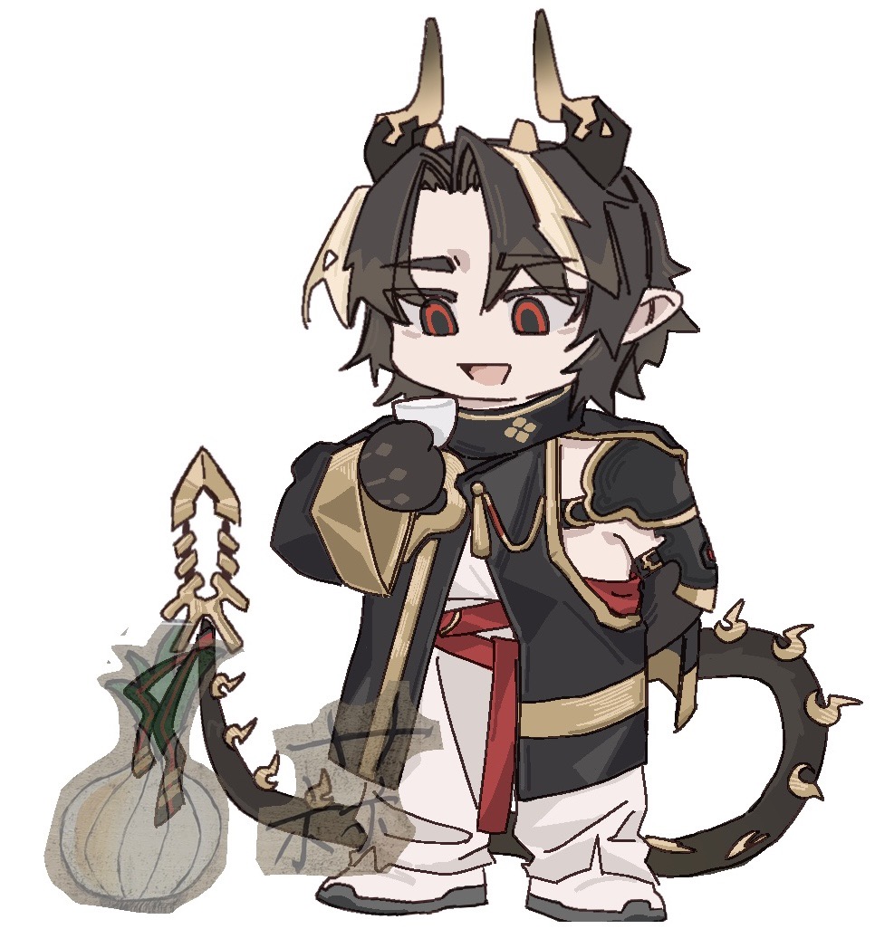 1boy arknights arm_behind_back black_hair blonde_hair chibi chinese_commentary choko_(cup) chongyue_(arknights) commentary_request cup full_body hair_intakes holding horns long_sleeves male_focus multicolored_hair onion open_mouth qianxidasuan_(suan_wu_cao) red_eyes simple_background smile solo split_mouth standing streaked_hair tail white_background
