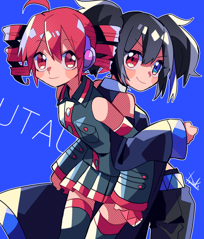 2girls belt black_hair black_pants black_shirt black_skirt black_sleeves black_thighhighs blue_background blue_belt blue_eyes buttons collared_shirt detached_sleeves double-parted_bangs drill_hair hair_between_eyes heterochromia kasane_teto kasane_teto_(utau) locked_arms long_sleeves midriff miniskirt multiple_girls pants pleated_skirt pocket red_eyes red_trim shirt signature skirt skirt_set sleeveless sleeveless_shirt smile striped_belt thighhighs twin_drills utau wing_collar yokune_ruko yuusuke-kun zettai_ryouiki