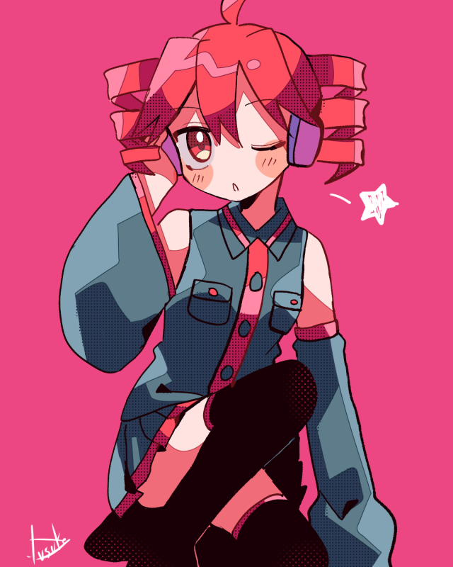 1girl :o ahoge black_shirt black_skirt black_thighhighs blush buttons collared_shirt detached_sleeves drill_hair hair_between_eyes hand_on_headphones headphones kasane_teto kasane_teto_(utau) long_sleeves looking_at_viewer miniskirt open_mouth parted_bangs pink_background pleated_skirt pocket red_eyes red_hair red_trim shirt signature simple_background skirt skirt_set sleeveless sleeveless_shirt solo star_(symbol) thighhighs triangle_mouth twin_drills utau wing_collar yuusuke-kun zettai_ryouiki