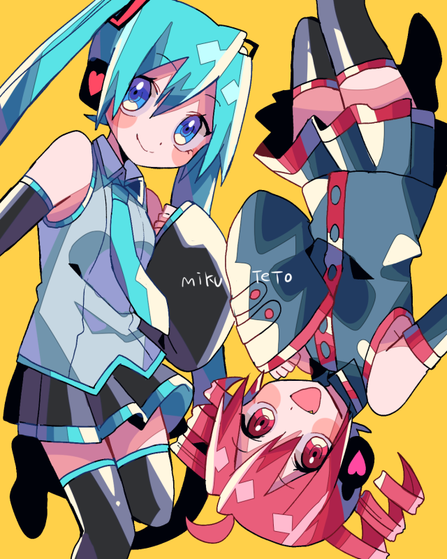 2girls ahoge black_sleeves black_thighhighs blue_eyes blue_hair blue_necktie character_name double-parted_bangs drill_hair foot_out_of_frame hair_between_eyes hair_ornament hand_up hatsune_miku headphones kasane_teto kasane_teto_(utau) long_sleeves multiple_girls necktie pleated_skirt red_hair red_trim shirt simple_background skirt sleeveless sleeveless_shirt standing standing_on_one_leg thighhighs twin_drills twintails upside-down utau vocaloid yellow_background yuusuke-kun zettai_ryouiki