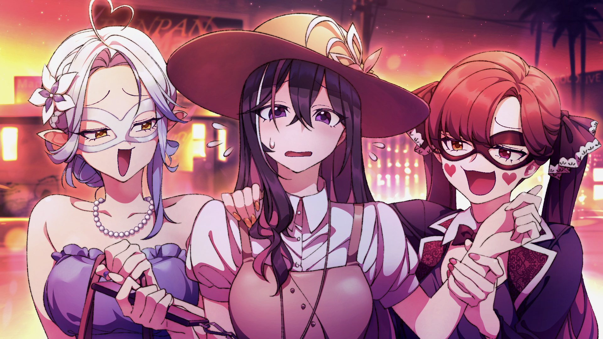3girls ahoge azki_(hololive) bead_necklace beads black_hair blue_hair cellphone colored_inner_hair domino_mask eye_mask flower flying_sweatdrops hair_flower hair_ornament hamburger_man._(sumi80) hat heart heart_ahoge heterochromia highres hololive houshou_marine jewelry mask multicolored_hair multiple_girls necklace phone pink_hair pointy_ears purple_eyes red_eyes red_hair smartphone twintails virtual_youtuber yellow_eyes yukihana_lamy