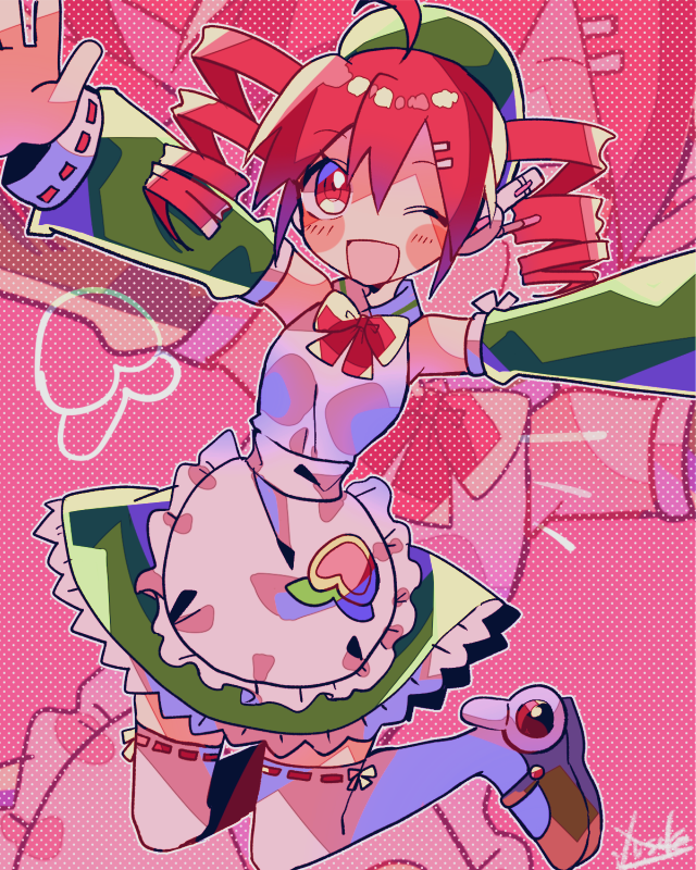 1girl ahoge apron bare_shoulders beret brown_shoes cosplay detached_sleeves dress drill_hair frilled_apron frills green_hat green_sleeves hair_ornament hat jumping kasane_teto layered_dress mary_janes momone_momo momone_momo_(cosplay) one_eye_closed pink_background red_hair shirt shoes signature sleeveless sleeveless_dress sleeveless_shirt solo thighhighs twin_drills utau white_apron white_thighhighs yuusuke-kun zettai_ryouiki