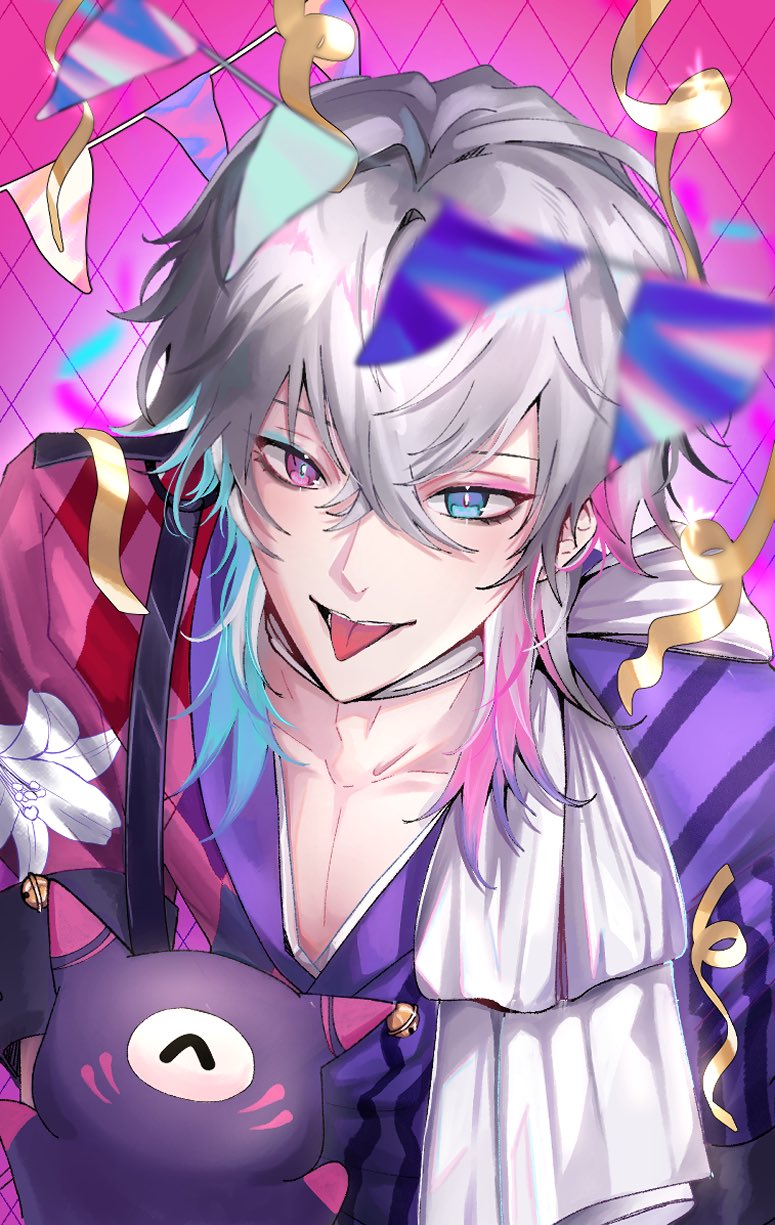 1boy bishounen blue_eyes blue_eyeshadow blue_hair coat collarbone confetti creature crossed_bangs eyeshadow floral_print from_above gavis_bettel gavis_bettel_(1st_costume) grey_hair hair_between_eyes hashtag-only_commentary heterochromia highres holding holostars holostars_english lily_print looking_at_viewer makeup male_focus medium_hair multicolored_coat multicolored_hair niicomode open_mouth pale_skin pectoral_cleavage pectorals phantom_(gavis_bettel) pink_eyes pink_eyeshadow pink_hair scarf smile streamers striped_coat tongue tongue_out upper_body vertical-striped_coat virtual_youtuber white_scarf