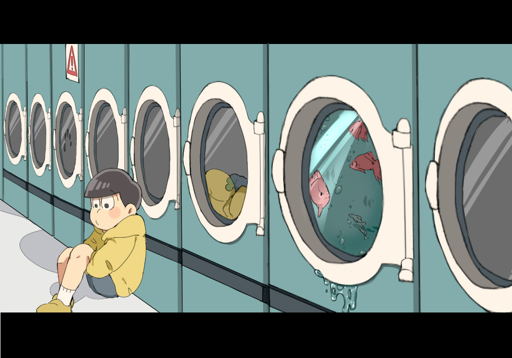 1boy ahoge air_bubble anime_coloring black_eyes blue_shorts blunt_bangs blush_stickers brown_hair bubble closed_mouth cloud_print commentary_request fish full_body hood hood_down hoodie hugging_own_legs knees knees_up letterboxed male_focus matsuno_jyushimatsu ninjin_35 osomatsu-san osomatsu_(series) reflection shoes short_hair shorts sign sitting socks solo warning_sign washing_machine water white_socks yellow_hoodie yellow_shoes