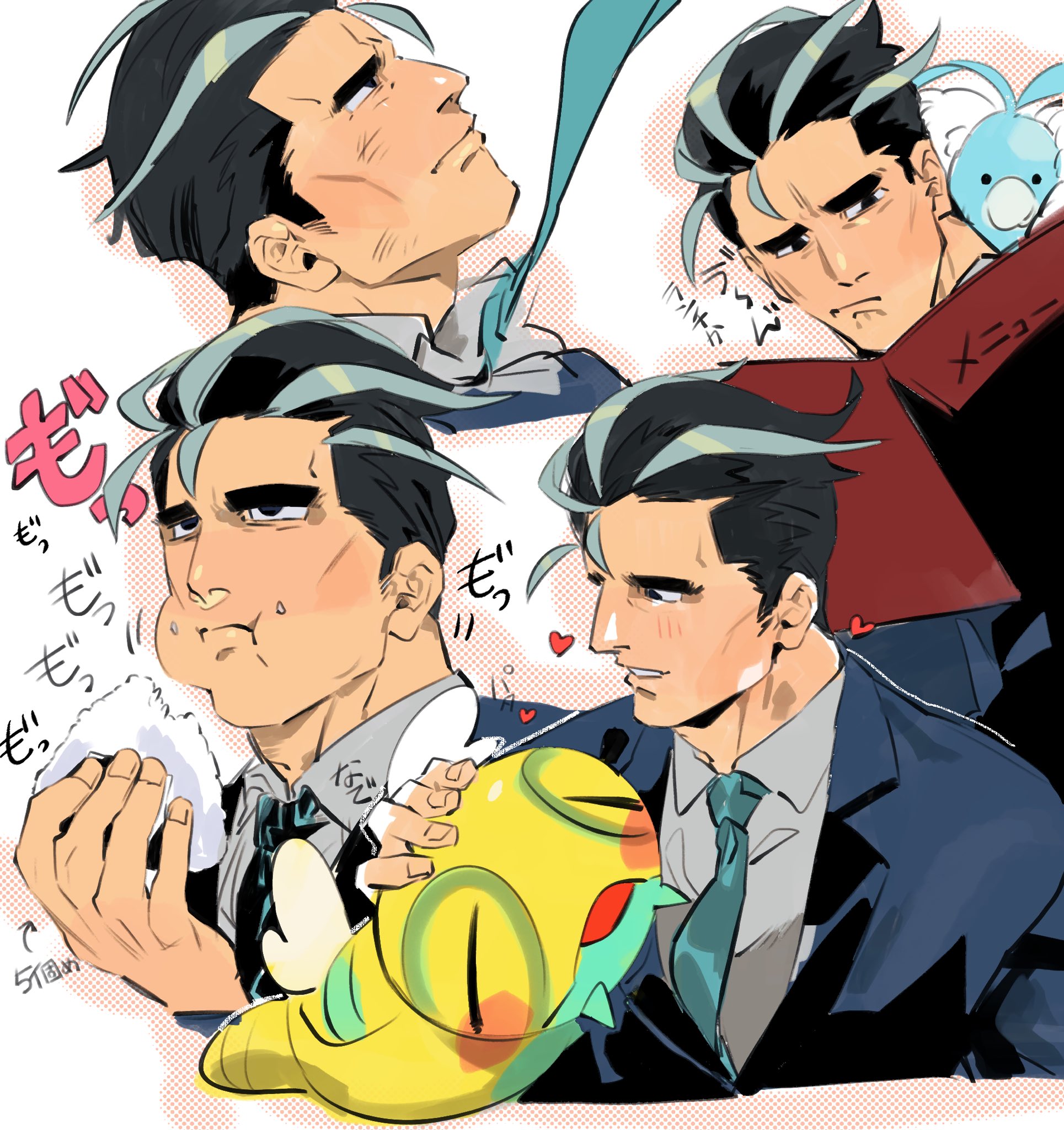 1boy ahoge beak bird black_eyes black_hair black_suit blue_necktie chewing closed_eyes cloud collared_shirt dunsparce eating food food_on_face formal_clothes gen_2_pokemon gen_3_pokemon green_(grimy) grey_shirt heart highres holding holding_food holding_menu larry_(pokemon) light_blush light_frown male_focus menu multicolored_hair necktie nintendo onigiri open_mouth petting pokemon pokemon_(creature) pokemon_sv reading rice rice_on_face salaryman shirt short_hair smile snake streaked_hair suit swablu thick_eyebrows thinking translation_request white_background wings