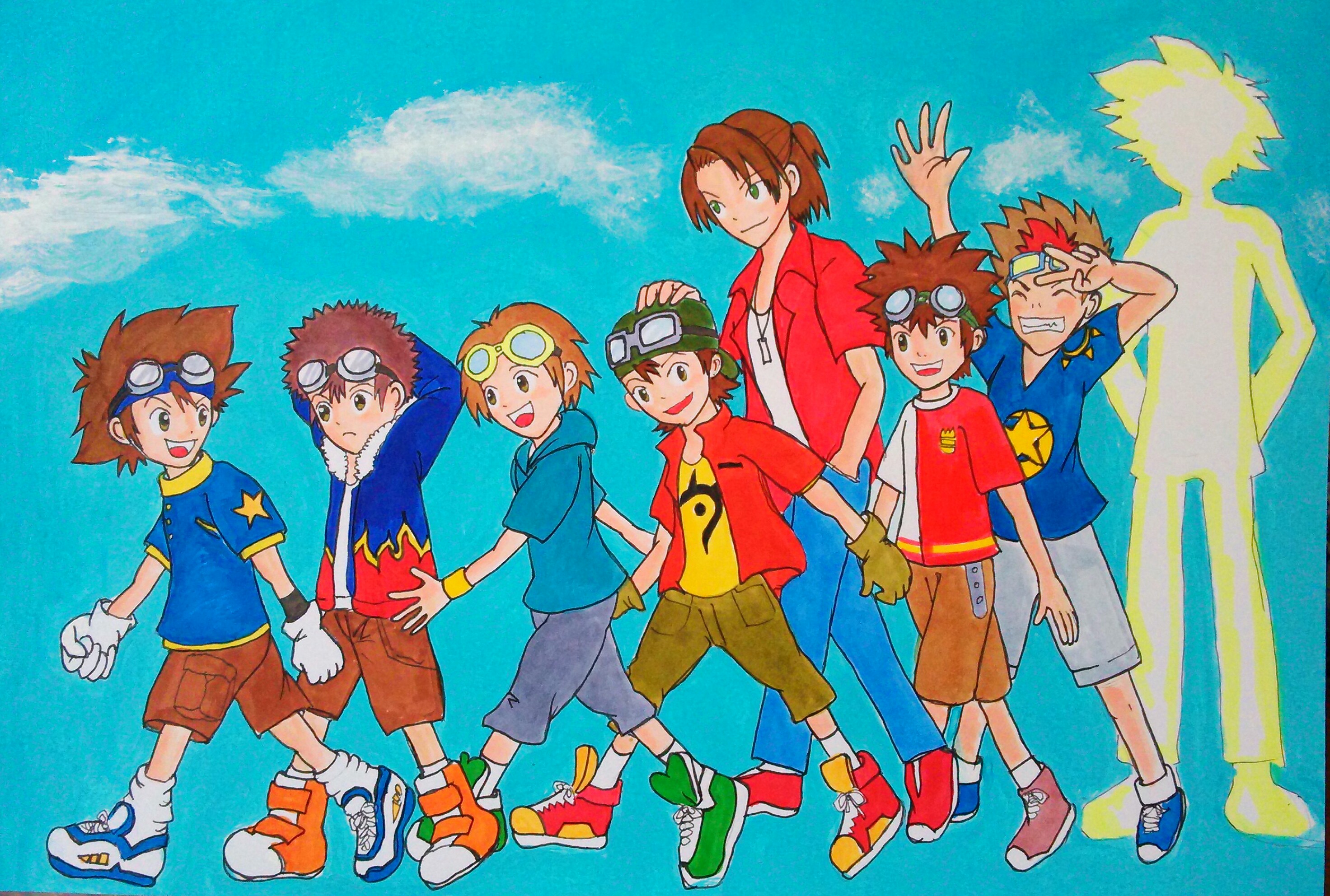 6+boys akashi_tagiru daimon_masaru_(digimon_savers) digimon digimon_adventure digimon_adventure_02 digimon_frontier digimon_savers digimon_tamers digimon_xros_wars digimon_xros_wars:_toki_wo_kakeru_shounen_hunter-tachi goggles goggles_on_head highres kanbara_takuya kudou_taiki matsuda_takato motomiya_daisuke multiple_boys short_hair yagami_taichi