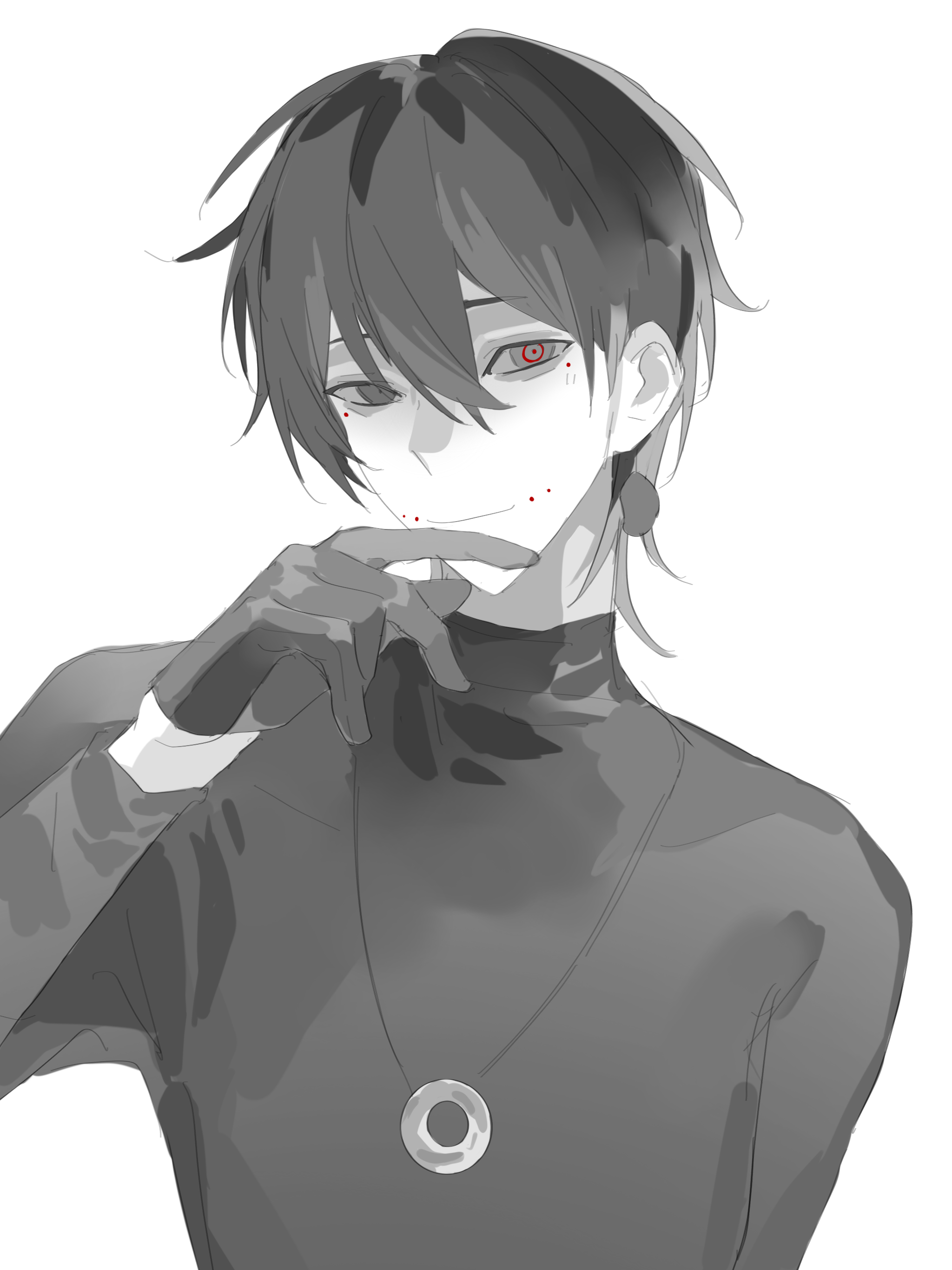 1boy absurdres chinese_commentary closed_mouth commentary_request facial_mark gloves greyscale hair_between_eyes half_gloves highres jewelry kuiji495 long_sleeves male_focus mark_under_both_eyes monochrome naihe_(male)_(touqi_guaitan) necklace short_hair simple_background smile solo spot_color touqi_guaitan turtleneck white_background