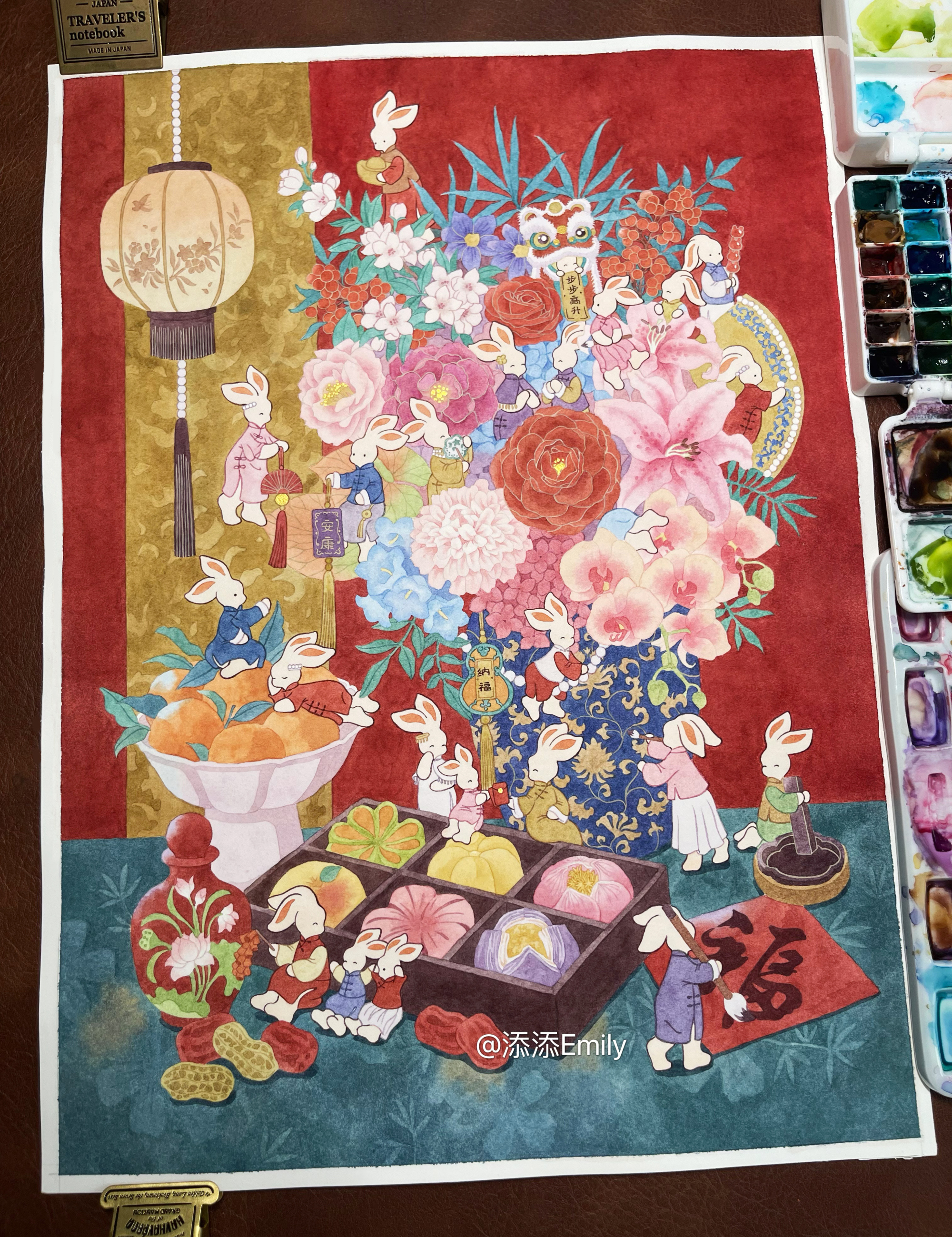 absurdres animal animal_focus art_tools_in_frame artist_name calligraphy_brush chinese_clothes chinese_zodiac clothed_animal dress flower food fruit fruit_bowl highres holding holding_calligraphy_brush holding_paintbrush lantern long_skirt mandarin_orange mochi no_humans original oversized_object paintbrush painting_(medium) paper_lantern peanut photo_(medium) pink_flower pink_shirt pleated_skirt postage_stamp purple_dress purple_flower rabbit red_flower red_rose rose shirt sitting skirt tassel tiantian_emily traditional_media undersized_animal vase watercolor_(medium) white_skirt year_of_the_rabbit