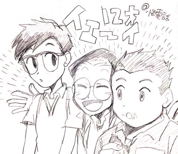 1girl 2boys digimon digimon_adventure digimon_adventure_02 digimon_frontier glasses inoue_miyako kido_jo multiple_boys open_mouth shibayama_junpei short_hair smile