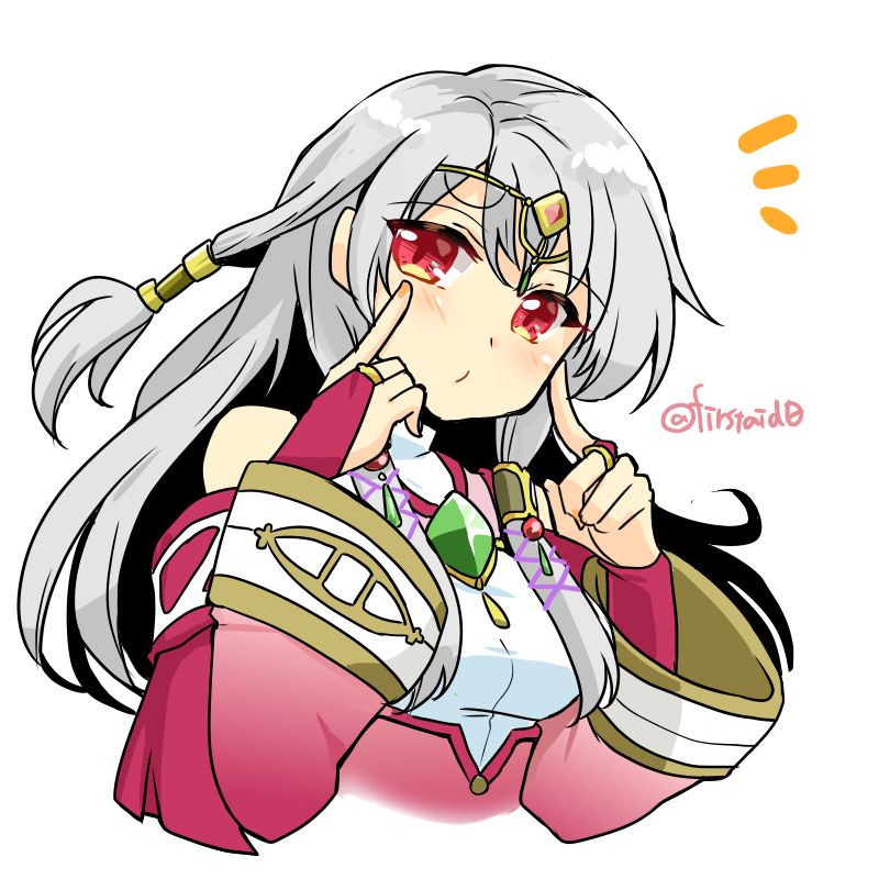 1girl alternate_eye_color artist_name bare_shoulders blush commentary dress english_text fire_emblem fire_emblem:_radiant_dawn hands_on_own_cheeks hands_on_own_face hands_on_own_head intelligent_systems long_hair long_sleeves looking_to_the_side micaiah_(fire_emblem) nail_polish nintendo official_alternate_eye_color possessed possession pout red_eyes solo solo_focus tiara white_background yukia_(firstaid0) yune_(fire_emblem)
