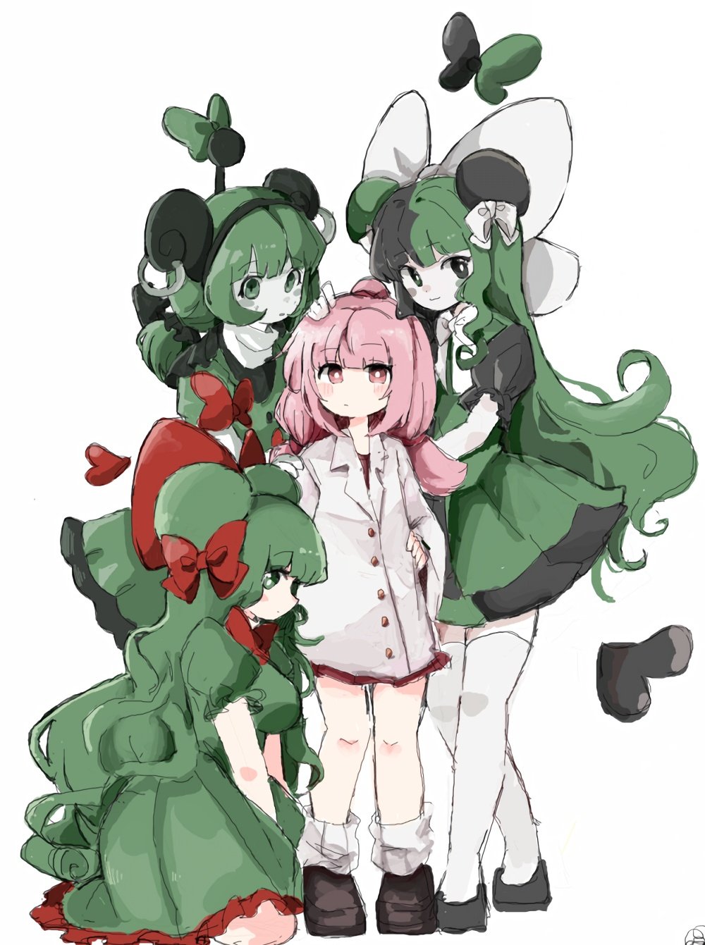4girls agochu_ketsuago black_eyes black_footwear bow brown_footwear buttons coat colored_skin crossed_legs curly_hair double_bun dress green_dress green_hair hair_bun highres long_hair low_twintails multicolored_hair multiple_girls pink_hair pucchi_woofwoof red_ribbon ribbon standing thighhighs towelket_wo_mou_ichido twintails two-tone_hair white_coat white_ribbon white_skin yukikaze2828