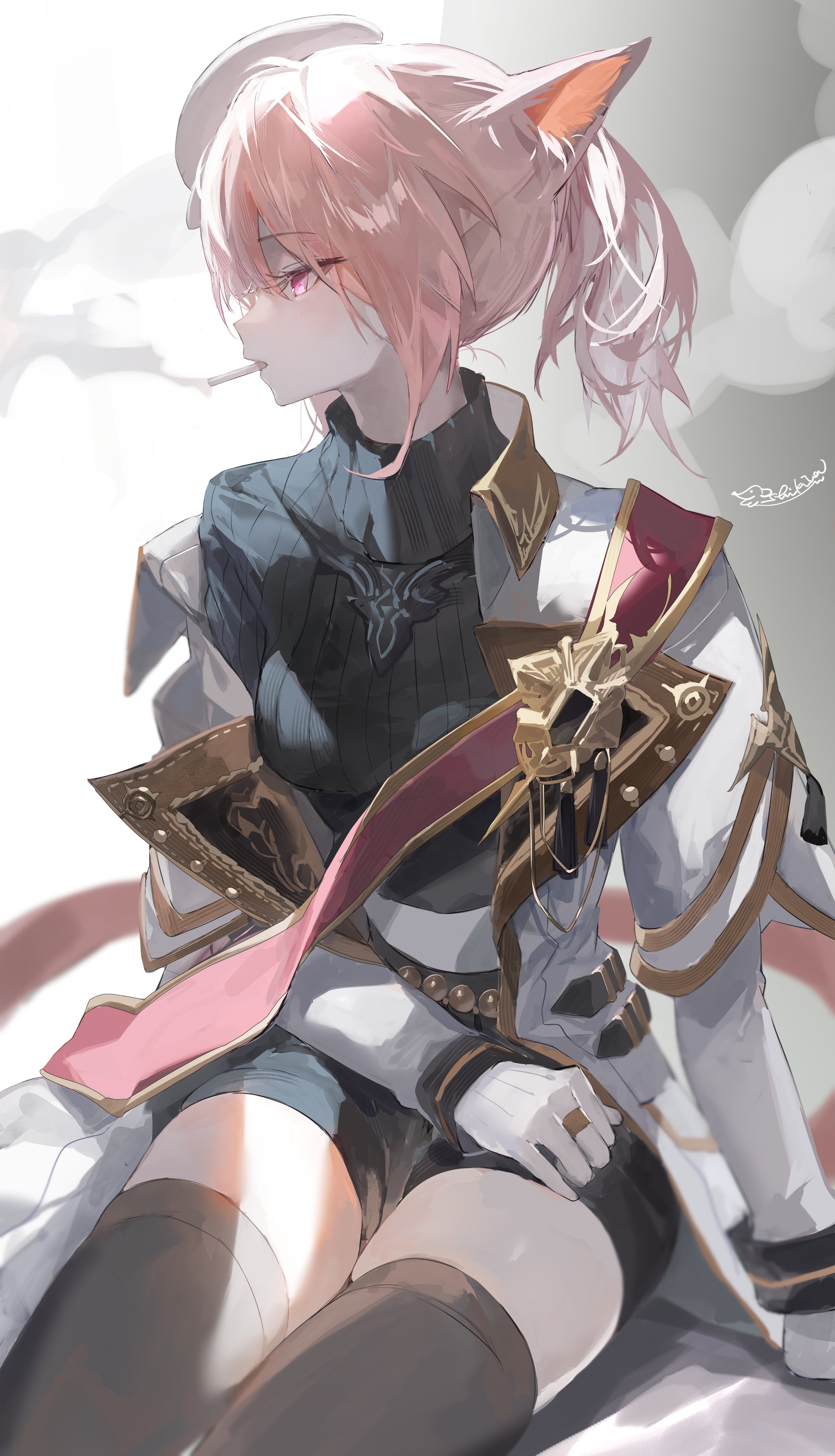 1girl absurdres animal_ears black_shirt black_shorts cat_ears cat_girl cat_tail cigarette coat coat_partially_removed final_fantasy final_fantasy_xiv gloves hat highres miqo'te pink_eyes pink_hair ponytail sash shikina_(mochigushi_) shirt shorts shoulder_sash sitting smoking solo tail thighhighs turtleneck turtleneck_shirt warrior_of_light_(ff14) white_coat white_gloves white_hat