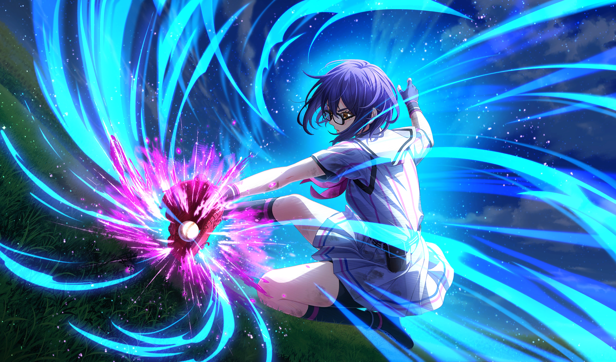 1girl aura ball baseball baseball_(object) baseball_field baseball_glove baseball_uniform belt belt_pouch bike_shorts bike_shorts_under_skirt black-framed_eyewear black_belt black_footwear black_gloves black_shorts black_socks blue_hair catching cinderella_series cloud coke-bottle_glasses dark_blue_hair dutch_angle emphasis_lines film_grain fingerless_gloves game_cg glasses gloves grass hachigatsu_no_cinderella_nine hair_between_eyes highres holding holding_ball light_particles neckerchief non-web_source official_art on_ground outdoors pink_neckerchief playing_sports pleated_skirt pouch rectangular_eyewear sakagami_mei satogahama_baseball_uniform shirt shirt_under_shirt short_hair short_sleeves shorts skirt sky sliding socks solo sportswear striped_belt striped_clothes striped_shirt undershirt vertical-striped_clothes vertical-striped_shirt wristband yellow_eyes