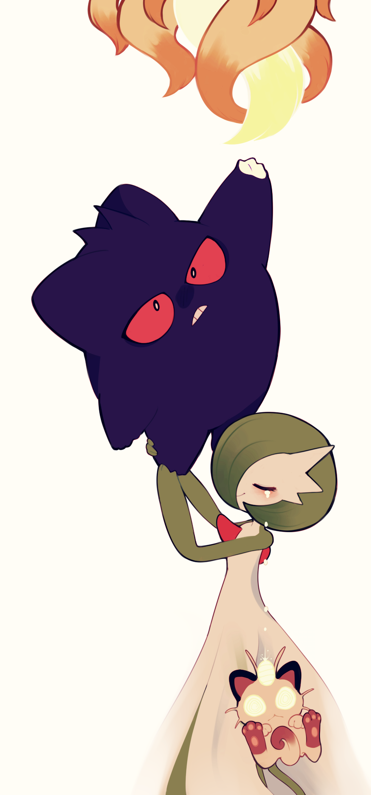 absurdres bob_cut clem_(calmeremerald) closed_eyes colored_skin from_side gardevoir gen_1_pokemon gen_3_pokemon gengar ghost glowing glowing_eyes green_hair green_skin highres meowth multicolored_skin ninetales nintendo pokemon pokemon_mystery_dungeon simple_background smile tears two-tone_skin white_skin