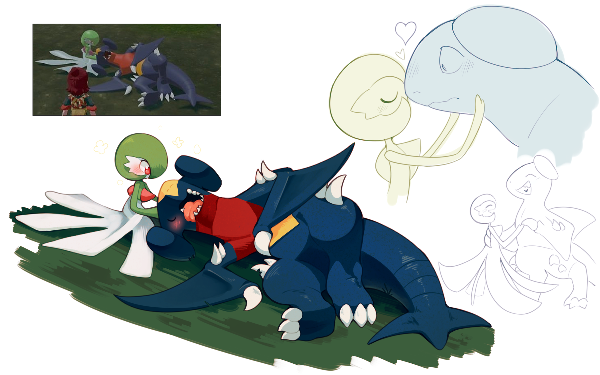 blush bob_cut claws clem_(calmeremerald) closed_eyes colored_skin dancing dragon dress fangs game_screenshot_inset garchomp gardevoir gen_3_pokemon gen_4_pokemon grass green_hair green_skin heart highres holding_hands kiss lying multicolored_skin multiple_views nintendo on_ground pink_eyes pokemon pokemon_(creature) pokemon_legends:_arceus reference_inset tongue tongue_out two-tone_skin white_dress white_skin