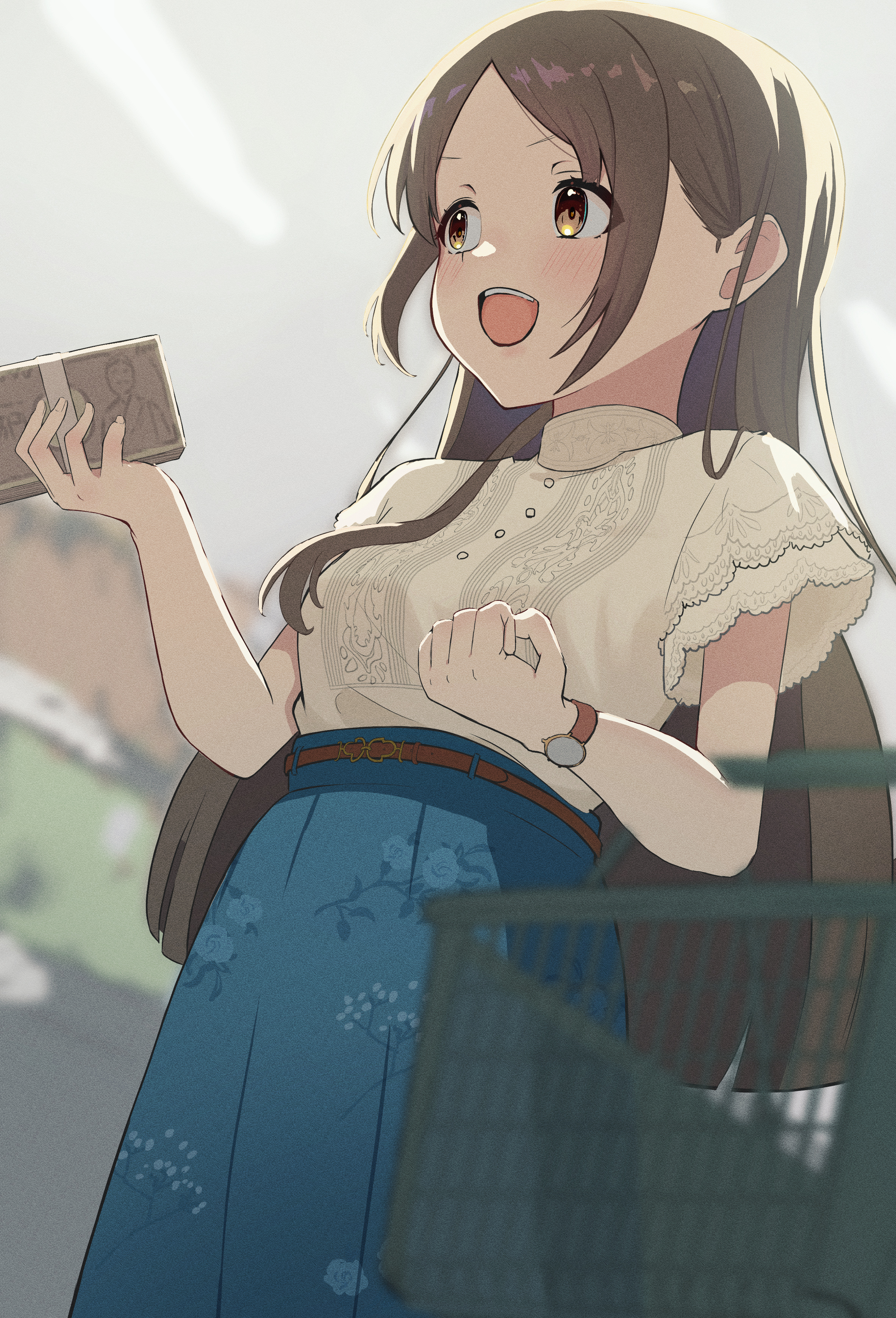 1girl absurdres aqua_skirt banknote blush brown_hair floral_print gakuen_idolmaster highres holding holding_money idolmaster kuramoto_china long_hair looking_to_the_side money shirt shirt_tucked_in shopping_basket skirt smile solo teeth to_mato upper_teeth_only very_long_hair watch white_shirt wristwatch
