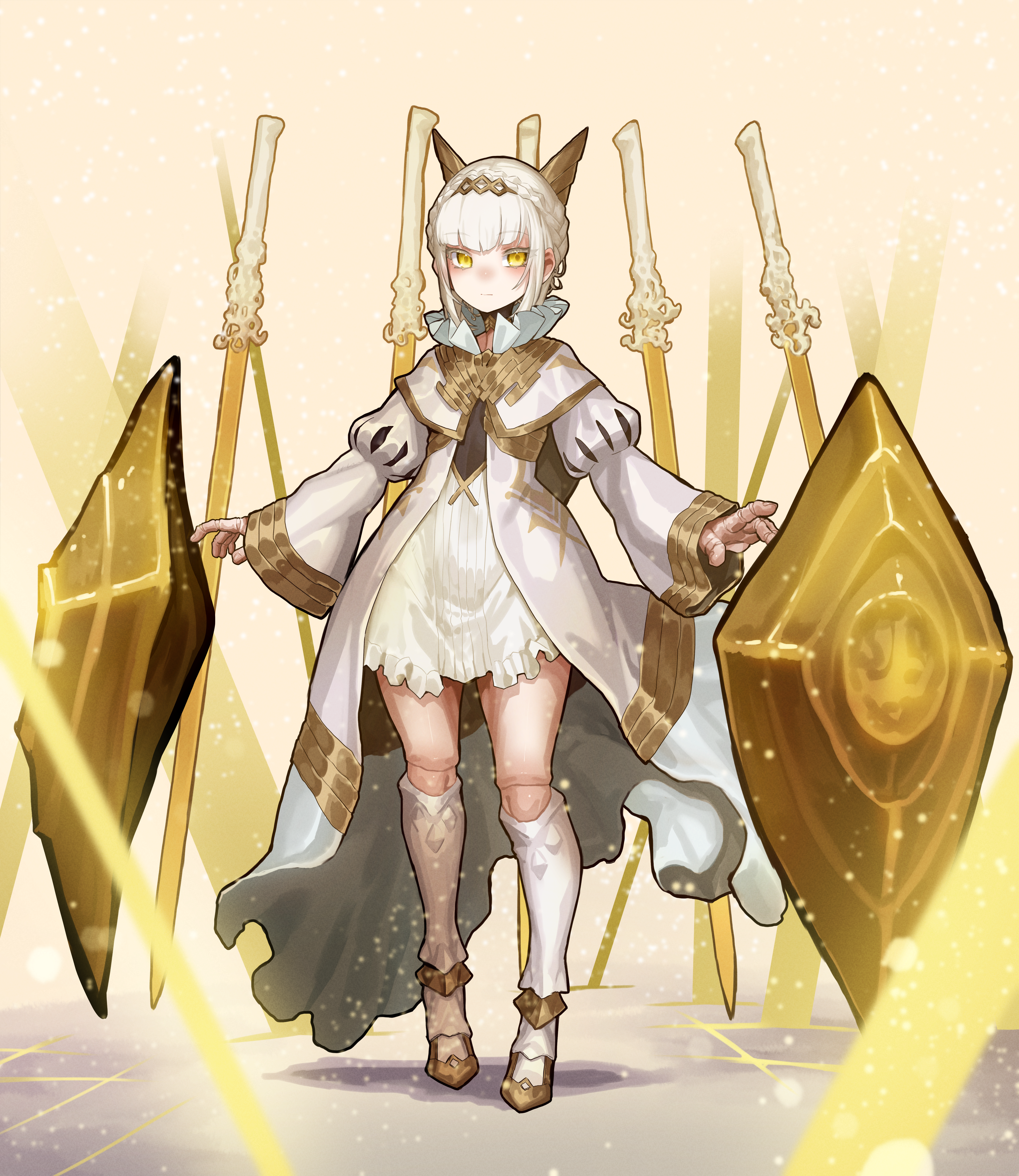 1girl absurdres capelet closed_mouth coat collared_capelet commentary_request doll_joints dress ekrea_jan full_body gold_trim golem highres joints kneehighs long_sleeves looking_at_viewer monster_girl original shoes simple_background socks solo standing tachi-e white_background white_capelet white_coat white_dress white_hair white_socks wide_sleeves yellow_eyes