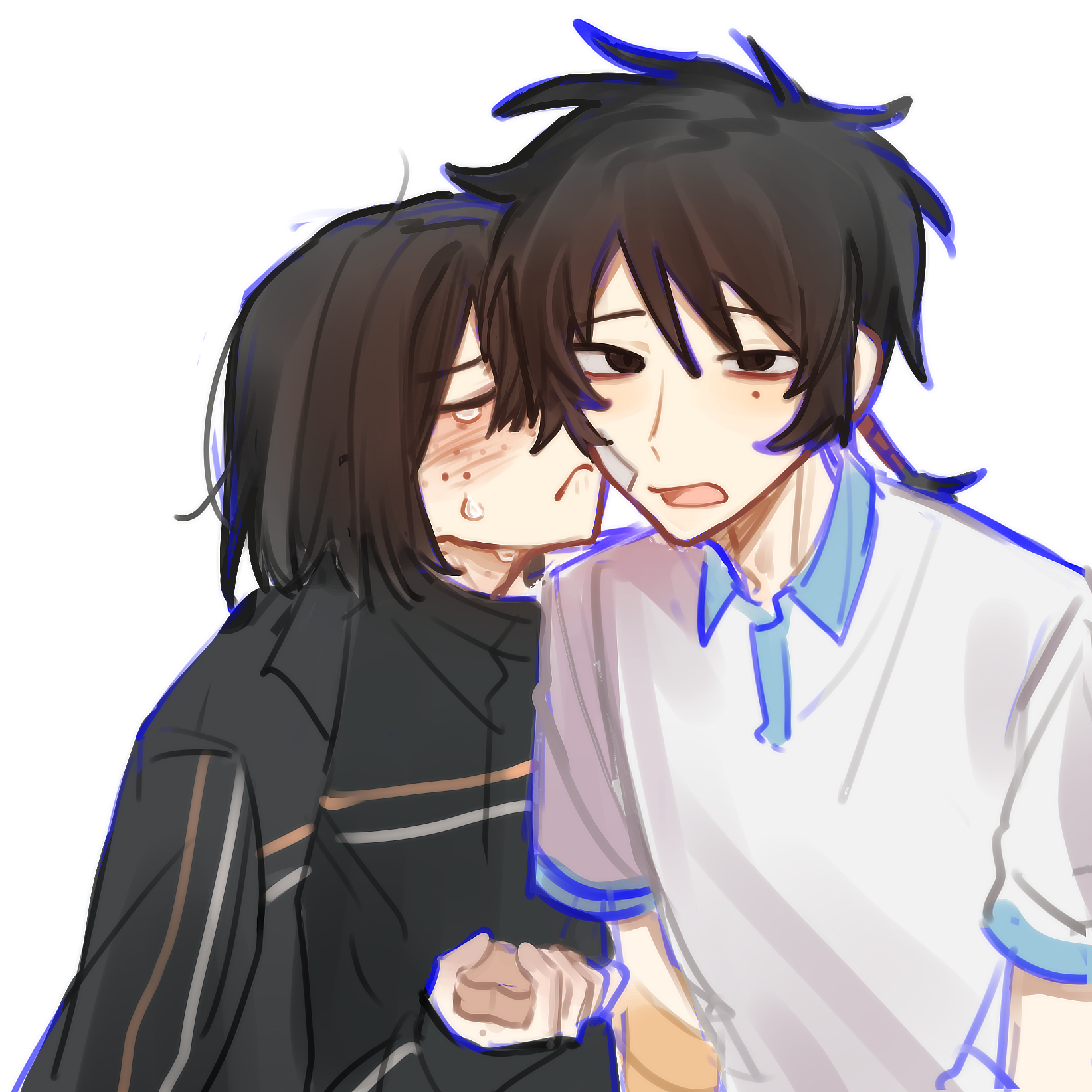2boys bandage_on_cheek black_eyes black_hair black_jacket blush chinese_commentary closed_mouth collared_shirt colored_lineart commentary_request crying freckles fu_shun_(touqi_guaitan) hand_up highres jacket junxiu_di_maoyi male_focus mole mole_under_eye multiple_boys open_mouth polo_shirt shirt short_hair short_sleeves simple_background sketch touqi_guaitan upper_body white_background white_shirt yaoi ziche_fuzhao