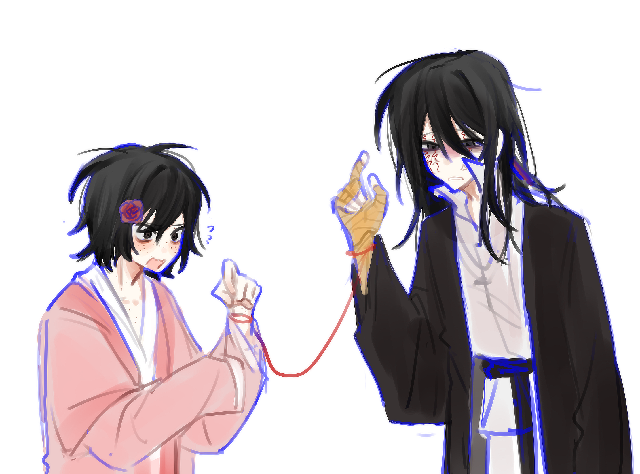 2boys alternate_costume bandaged_hand bandages black_coat black_eyes black_hair body_freckles chinese_clothes chinese_commentary coat colored_lineart commentary_request facial_tattoo flower flying_sweatdrops freckles fu_shun_(touqi_guaitan) hair_flower hair_ornament hand_up hanfu height_difference highres junxiu_di_maoyi long_hair long_sleeves male_focus multiple_boys open_clothes open_coat open_mouth pink_hanfu red_flower shirt short_hair simple_background sketch string string_of_fate tattoo touqi_guaitan upper_body white_background white_shirt ziche_fuzhao