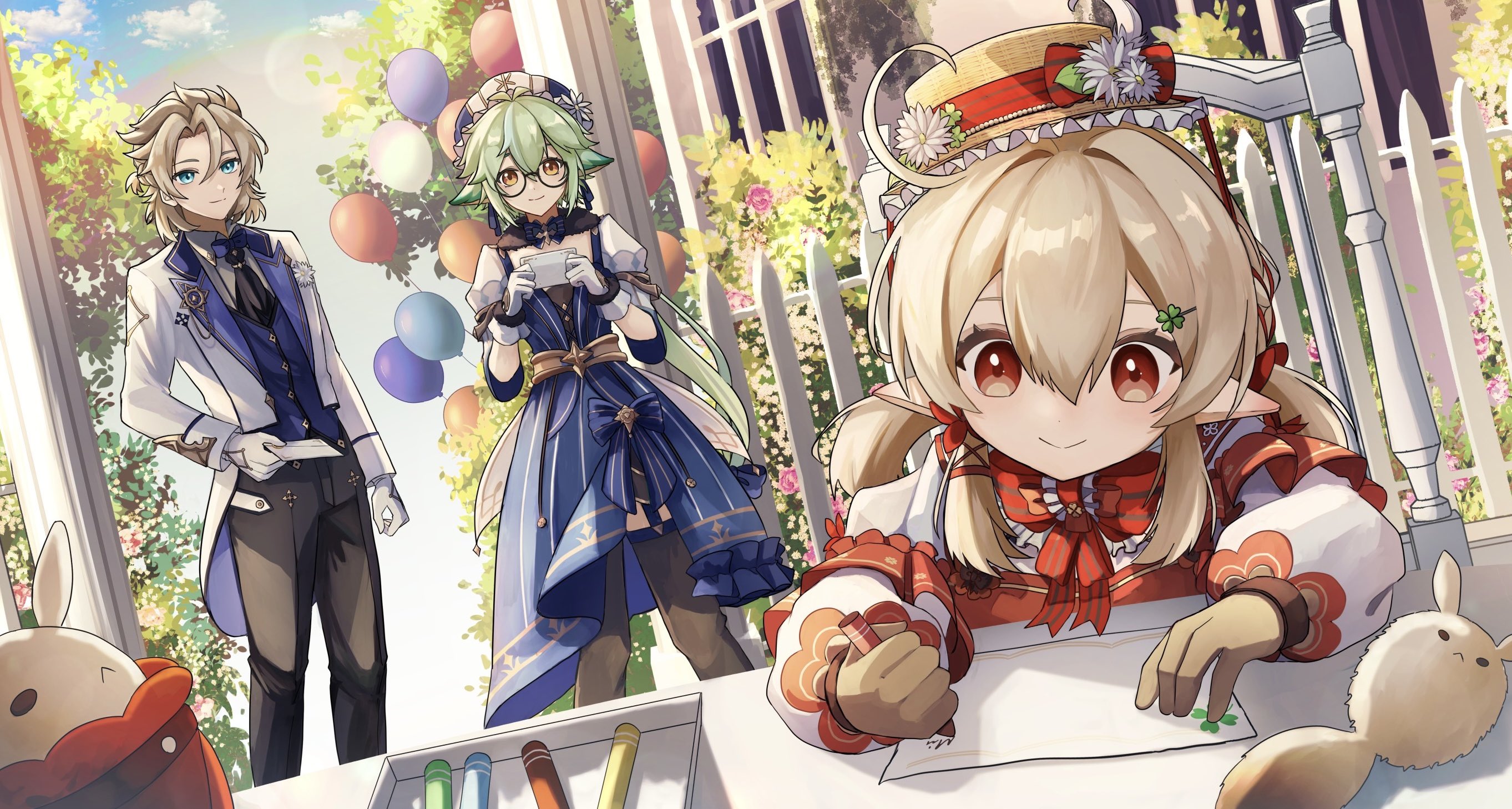 1boy 2girls 403pa ahoge albedo_(genshin_impact) animal_ears black_pantyhose bow bowtie brown_gloves closed_mouth dress genshin_impact glasses gloves green_hair hair_between_eyes highres holding holding_letter klee_(genshin_impact) letter light_brown_hair long_hair long_sleeves looking_at_viewer medium_hair multiple_girls outdoors pantyhose pointy_ears red_bow red_bowtie red_eyes short_sleeves short_twintails smile standing sucrose_(genshin_impact) twintails white_gloves
