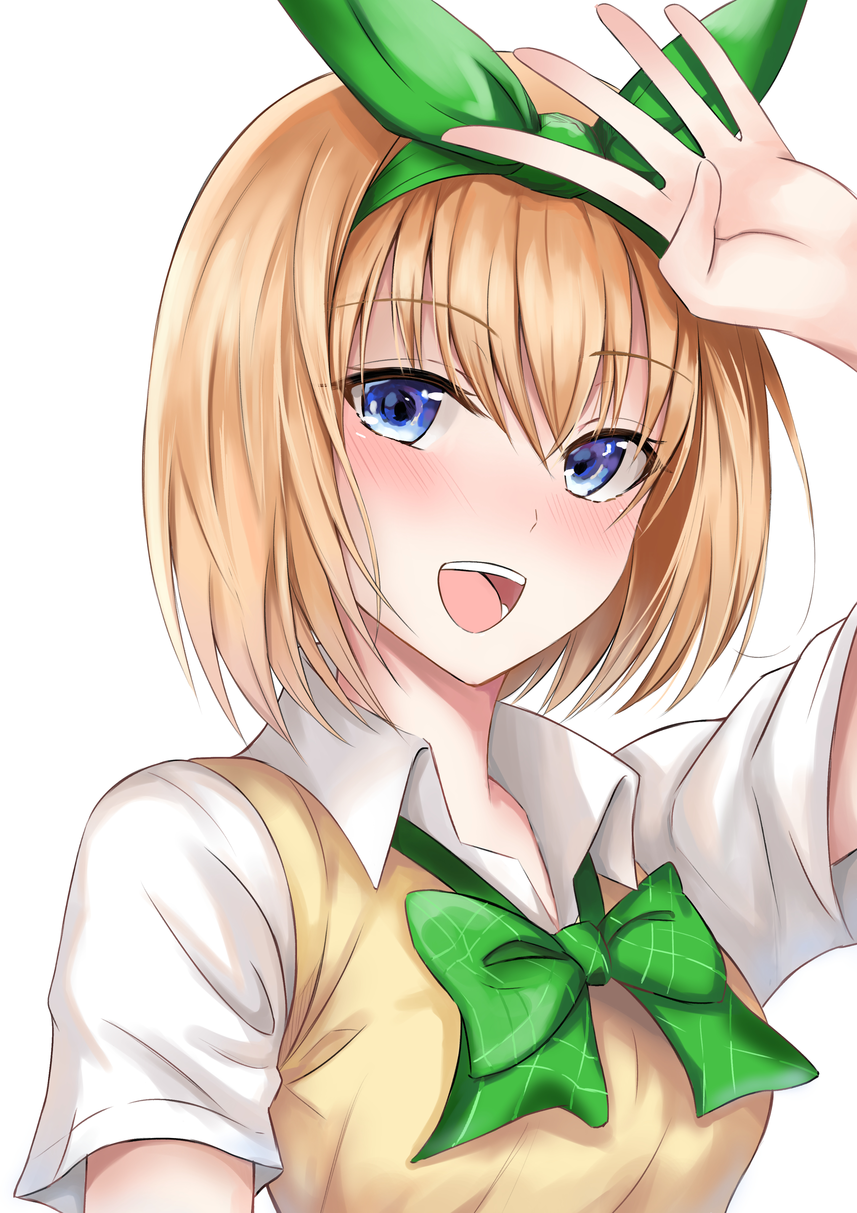 1girl absurdres blue_eyes blush bow bowtie collared_shirt go-toubun_no_hanayome green_bow green_bowtie green_ribbon hair_ribbon hand_on_own_forehead highres hoshinori19 looking_at_viewer nakano_yotsuba open_mouth orange_hair portrait ribbon school_uniform shirt short_sleeves simple_background solo summer_uniform sweater_vest upper_body white_background white_shirt yellow_sweater_vest