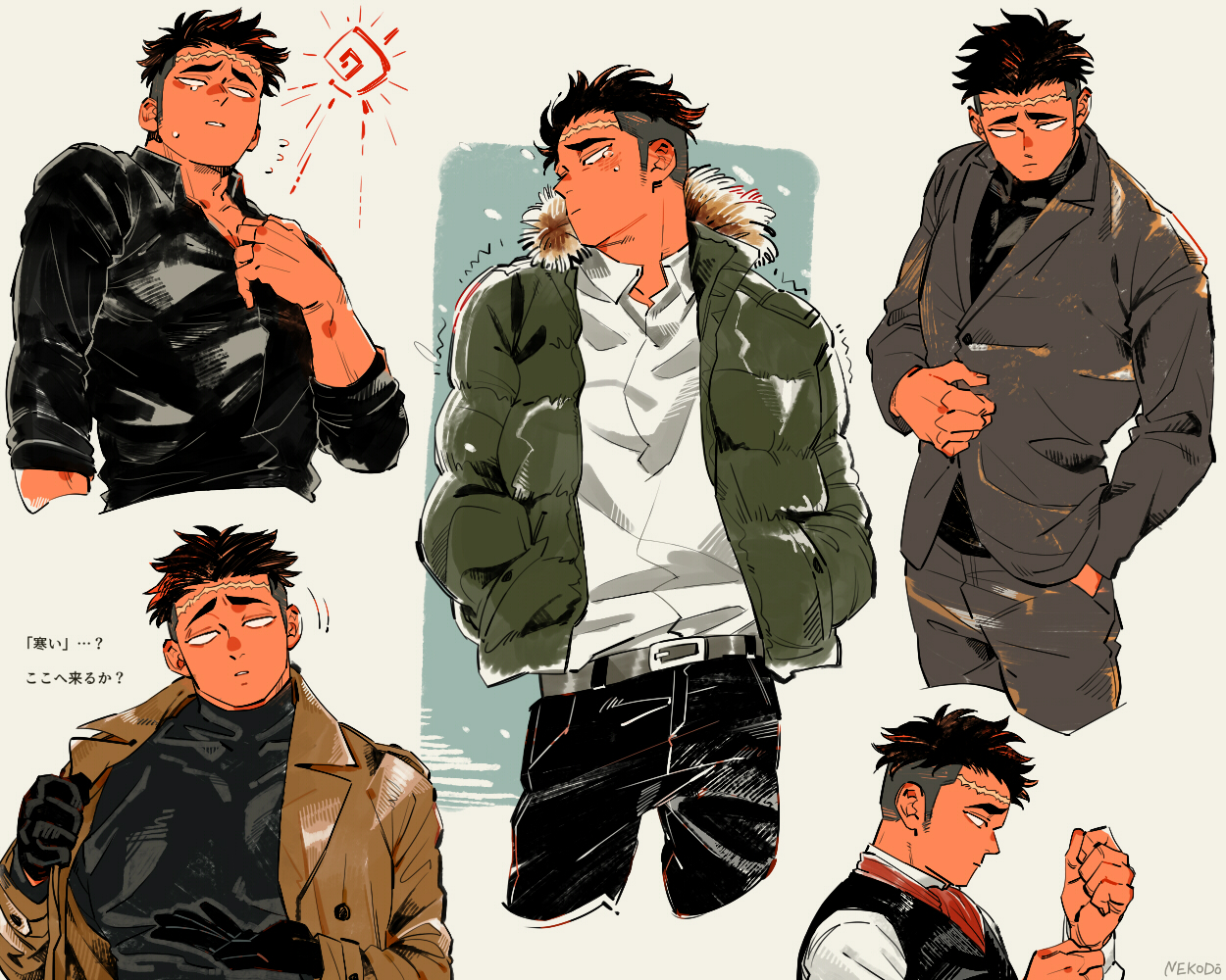 alternate_costume ascot belt black_gloves black_hair black_pants black_shirt black_vest blank_eyes brown_coat casual coat down_jacket dress_shirt formal_clothes fur-trimmed_jacket fur_trim gloves green_jacket grey_suit hand_in_pocket hands_in_pockets himejima_gyoumei jacket kimetsu_no_yaiba long_sleeves male_focus multiple_boys multiple_views nekodou_(yukatin1000) pants red_ascot scar scar_on_face scar_on_forehead shirt short_hair sleeves_rolled_up suit teardrop thick_eyebrows turtleneck undercut vest white_jacket