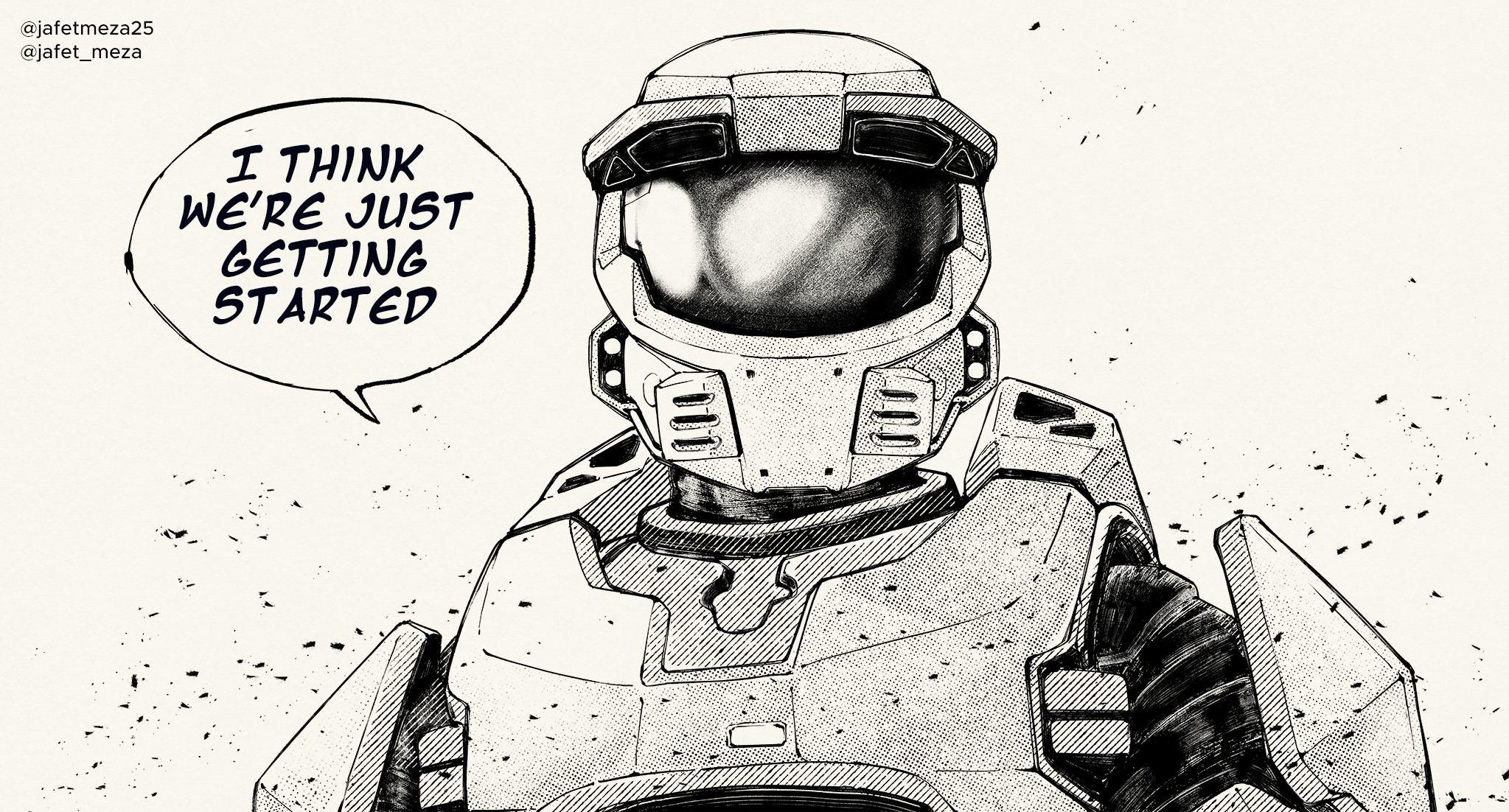 1boy armor assault_visor commentary english_commentary english_text greyscale halo:_combat_evolved halo_(series) helmet highres jafet_meza looking_at_viewer male_focus master_chief monochrome portrait power_armor solo spartan_(halo) speech_bubble twitter_username