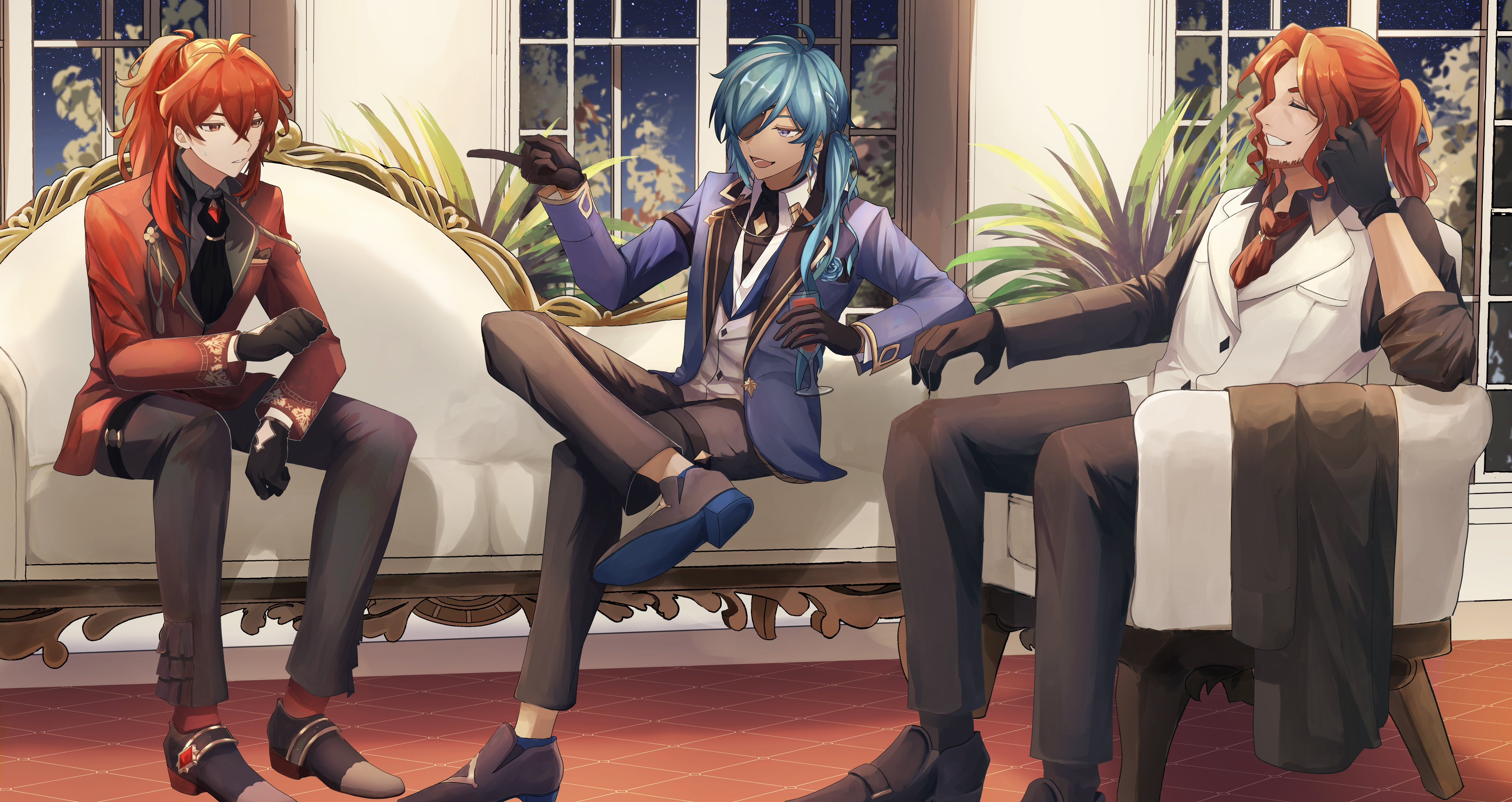 3boys 403pa absurdres black_footwear black_gloves black_necktie black_shirt blue_eyes blue_hair blue_jacket brown_footwear brown_pants closed_eyes closed_mouth couch crepus_(genshin_impact) dark-skinned_male dark_skin diluc_(genshin_impact) earrings eyepatch genshin_impact gloves hair_between_eyes highres jacket jewelry kaeya_(genshin_impact) long_hair long_sleeves male_focus multicolored_hair multiple_boys necktie open_mouth pants ponytail red_eyes red_hair red_jacket shirt shoes smile vest white_vest