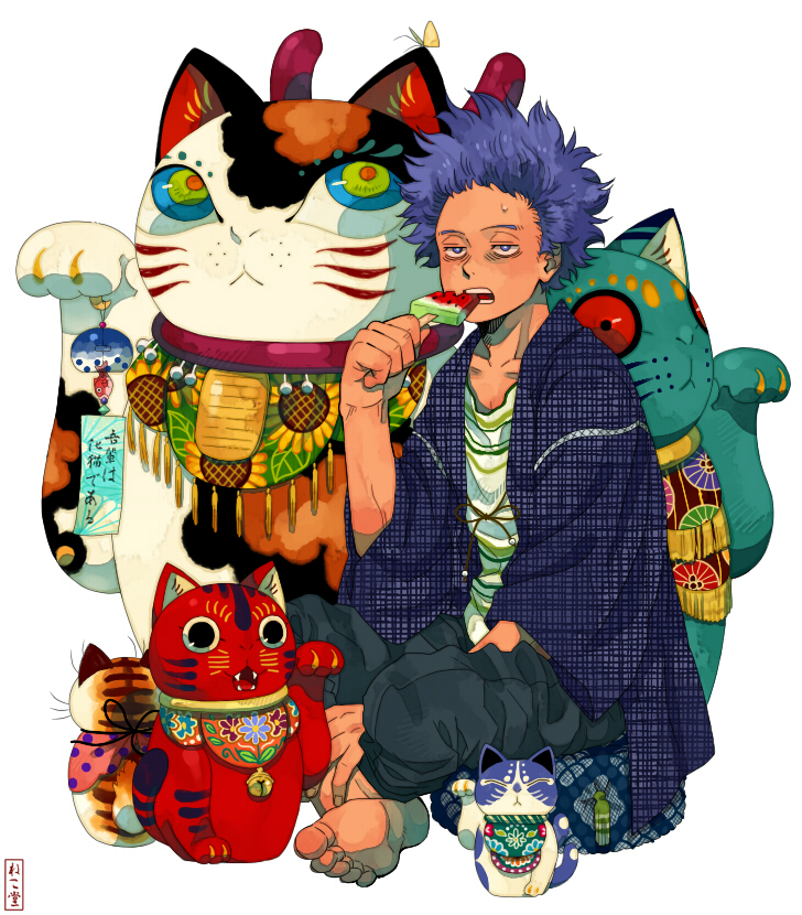 1boy bags_under_eyes barefoot black_pants boku_no_hero_academia bright_pupils eating food indian_style japanese_clothes jinbei_(clothes) long_sleeves looking_at_viewer male_focus maneki-neko nekodou_(yukatin1000) open_mouth pants popsicle purple_eyes purple_hair shinso_hitoshi shirt short_hair simple_background sitting spiked_hair watermelon_bar white_background white_pupils