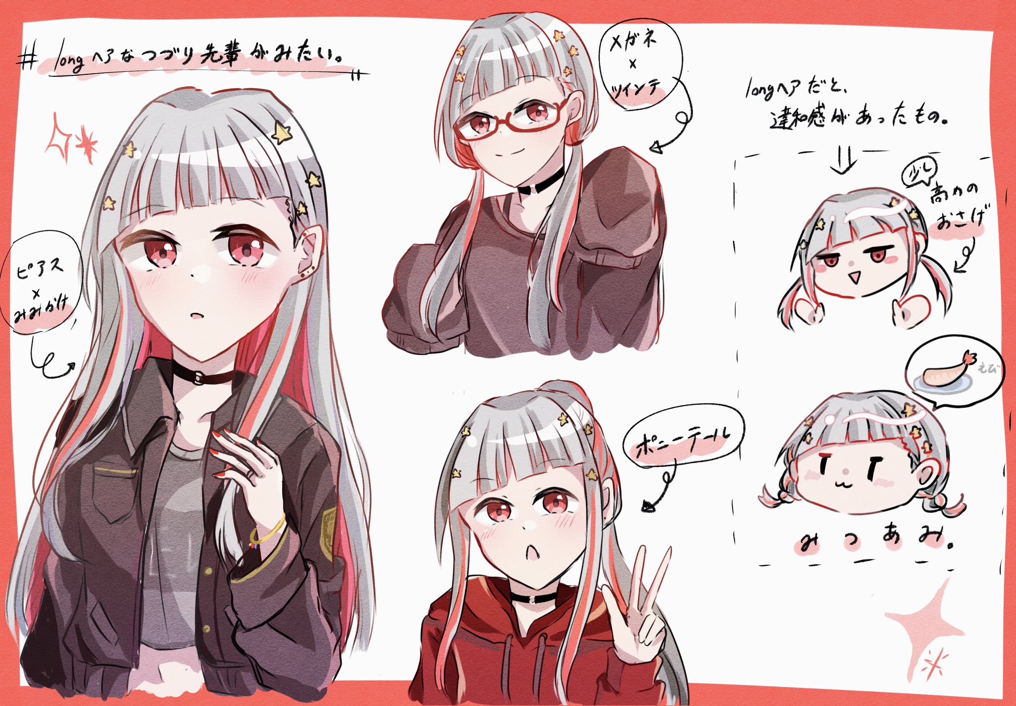 1girl :3 alternate_hair_length alternate_hairstyle arrow_(symbol) bespectacled black_choker black_jacket blush border breast_pocket casual choker closed_mouth collarbone colored_inner_hair commentary_request cropped_shirt cropped_torso diagonal_bangs earrings glasses grey_hair grey_shirt grey_sweater hair_ornament hashtag highres hood hoodie jacket jewelry jitome link!_like!_love_live! long_hair long_sleeves looking_at_viewer love_live! low_twintails multicolored_hair multiple_views o-ring o-ring_choker open_clothes open_jacket open_mouth outside_border pocket red-framed_eyewear red_border red_eyes red_hair red_hoodie red_nails semi-rimless_eyewear shirt sidelocks simple_background sleeves_past_fingers sleeves_past_wrists smile split_mouth star_(symbol) star_hair_ornament strap streaked_hair stud_earrings sweater translation_request tumugi06hana twintails under-rim_eyewear virtual_youtuber w white_background yugiri_tsuzuri |_|
