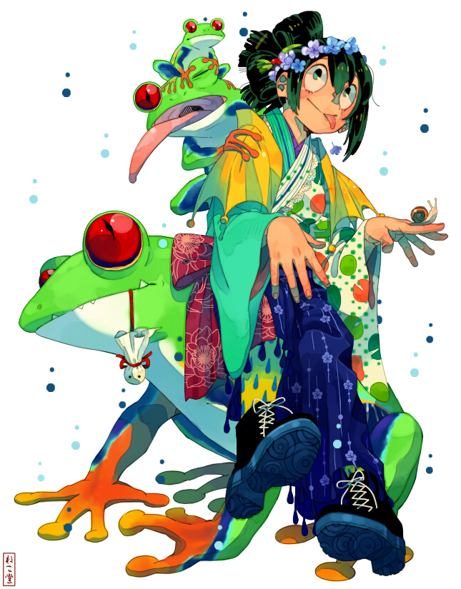 1girl alternate_costume asui_tsuyu black_footwear blush boku_no_hero_academia boots colored_sclera frog frog_girl furisode green_hair hair_between_eyes japanese_clothes kimono long_hair long_tongue nekodou_(yukatin1000) one_eye_closed red_sclera simple_background sitting_on_animal smile snail teruterubouzu tongue tongue_out tsubushi_shimada