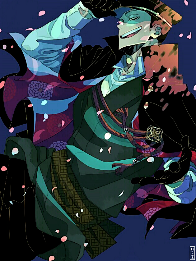 1boy 1girl adjusting_clothes adjusting_headwear alternate_costume black_capelet black_gloves black_hair black_hat black_pants blue_background boku_no_hero_academia capelet closed_eyes falling_petals gloves half_gloves hat high_collar japanese_clothes kimono long_sleeves male_focus nekodou_(yukatin1000) open_mouth pants peaked_cap petals reaching shirt short_hair solo teeth upper_teeth_only very_short_hair white_shirt yoarashi_inasa