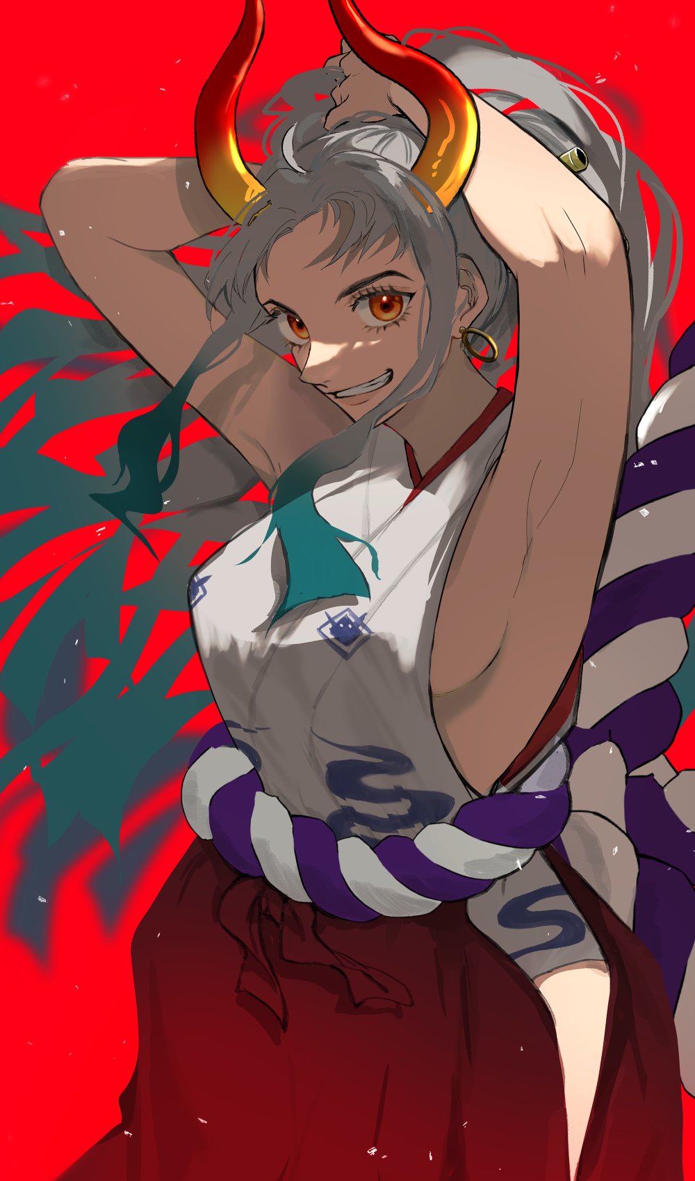 1girl akmn armpits arms_up breasts grin highres horns long_hair looking_at_viewer multicolored_hair one_piece orange_eyes red_background sideboob smile solo teeth very_long_hair white_hair yamato_(one_piece)