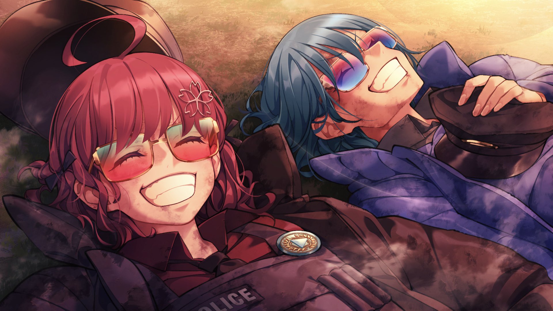 2girls ahoge blue_hair bulletproof_vest closed_eyes dirty dirty_face grin hair_ornament hamburger_man._(sumi80) happy hashtag-only_commentary hat highres hololive hoshimachi_suisei lying multiple_girls on_back pink_hair police_hat sakura_miko smile sunglasses virtual_youtuber