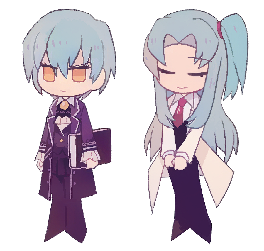 1girl 20_(1more_surren) angela_(project_moon) ascot black_pants black_skirt black_vest blue_coat blue_hair brooch closed_mouth coat collared_shirt full_body gem jewelry lapels library_of_ruina lobotomy_corporation long_hair multiple_views necktie notched_lapels one_side_up pants parted_bangs project_moon red_necktie shirt short_hair sidelocks simple_background skirt very_long_hair vest white_ascot white_background white_shirt yellow_eyes yellow_gem
