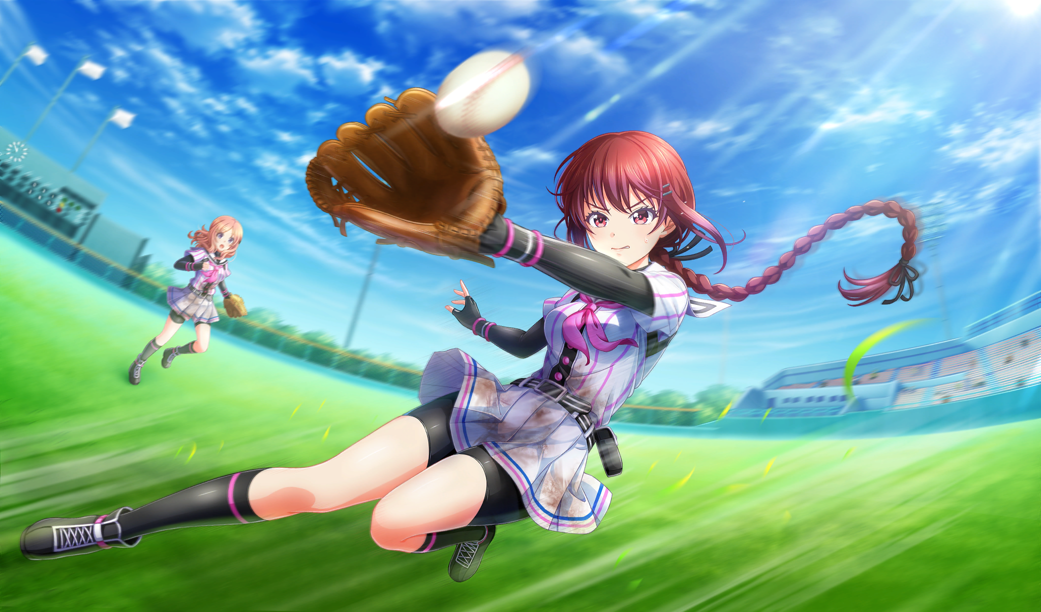 2girls ball baseball baseball_(object) baseball_glove baseball_stadium baseball_uniform belt belt_buckle belt_pouch bike_shorts bike_shorts_under_skirt black_belt black_footwear black_gloves black_ribbon black_shorts black_socks blurry braid braided_ponytail buckle catching cinderella_series clenched_teeth cloud depth_of_field falling_leaves fingerless_gloves fisheye flag full_body game_cg gloves grass hachigatsu_no_cinderella_nine hair_ornament hair_ribbon hairclip hanayama_emi highres kurashiki_maiko layered_sleeves leaf light_rays long_hair long_sleeves looking_at_object motion_blur motion_lines multiple_girls neckerchief non-web_source official_art on_ground outdoors pink_hair pink_neckerchief playing_sports pleated_skirt pouch red_hair ribbon satogahama_baseball_uniform scoreboard shirt shirt_under_shirt short_over_long_sleeves short_sleeves shorts single_braid skirt sky sliding socks solo_focus speed_lines sportswear striped_belt striped_clothes striped_shirt sunbeam sunlight sweat teeth undershirt v-shaped_eyebrows vertical-striped_clothes vertical-striped_shirt very_long_hair wristband