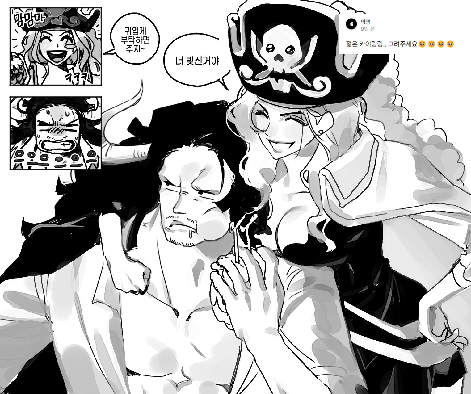 1boy 1girl ^_^ beard charlotte_linlin closed_eyes coat coat_on_shoulders devil_fruit dress eating facial_hair greyscale hand_on_own_hip hat hat_feather highres horns hug hug_from_behind kaidou_(one_piece) korean_text long_hair monochrome one_piece pirate_hat ppyobong11 smile speech_bubble translation_request