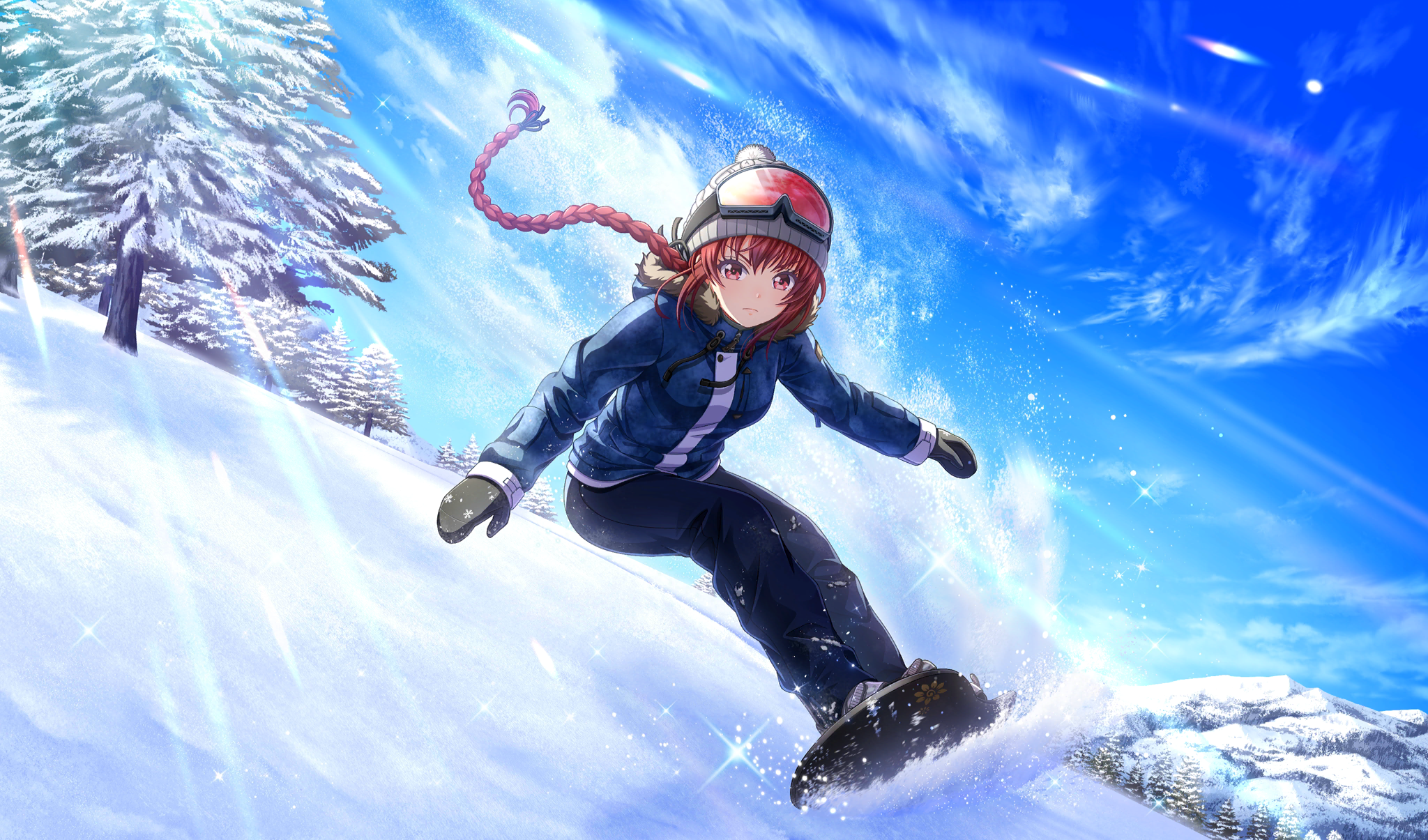 1girl black_mittens black_pants black_ribbon braid braided_ponytail cinderella_series closed_mouth cloud coat full_body game_cg goggles goggles_on_headwear hachigatsu_no_cinderella_nine hair_ribbon hat highres knit_hat kurashiki_maiko light_rays long_hair mittens multicolored_coat non-web_source official_art outdoors pants pine_tree red_hair ribbon single_braid ski_goggles sky snow snowboard snowboarding solo sparkle sunbeam sunlight tree two-tone_coat v-shaped_eyebrows very_long_hair white_hat winter_clothes