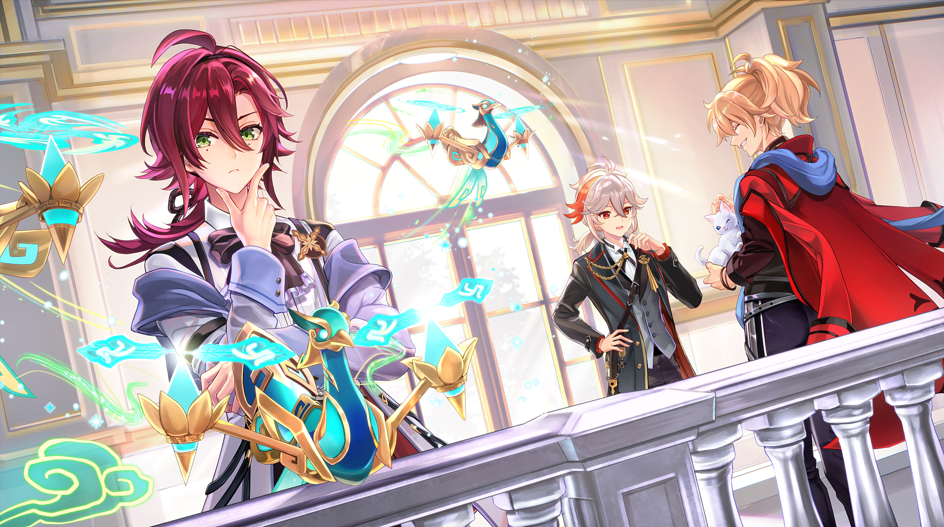 3boys :d ^_^ ahoge aiguillette animal antenna_hair aratakosu_(tako's) black_bow black_bowtie black_coat black_pants black_ribbon black_shirt blue_scarf bow bowtie bracelet buttons cat closed_eyes coat coat_on_shoulders commentary_request crossed_bangs genshin_impact green_eyes grey_vest hair_between_eyes hair_intakes hand_on_own_chin hand_on_own_hip hand_up high_ponytail highres holding holding_animal holding_cat indoors jewelry kaedehara_kazuha kazuha's_friend_(genshin_impact) lapels light_brown_hair long_hair long_sleeves looking_at_another looking_at_viewer low_ponytail male_focus mole mole_under_eye multicolored_hair multiple_boys multiple_moles neck_ribbon open_clothes open_coat open_mouth pants parted_bangs parted_lips ponytail purple_coat railing red_eyes red_hair red_scarf ribbon scarf shikanoin_heizou shirt sidelocks sleeve_cuffs smile standing streaked_hair tassel vest white_cat white_hair white_shirt window